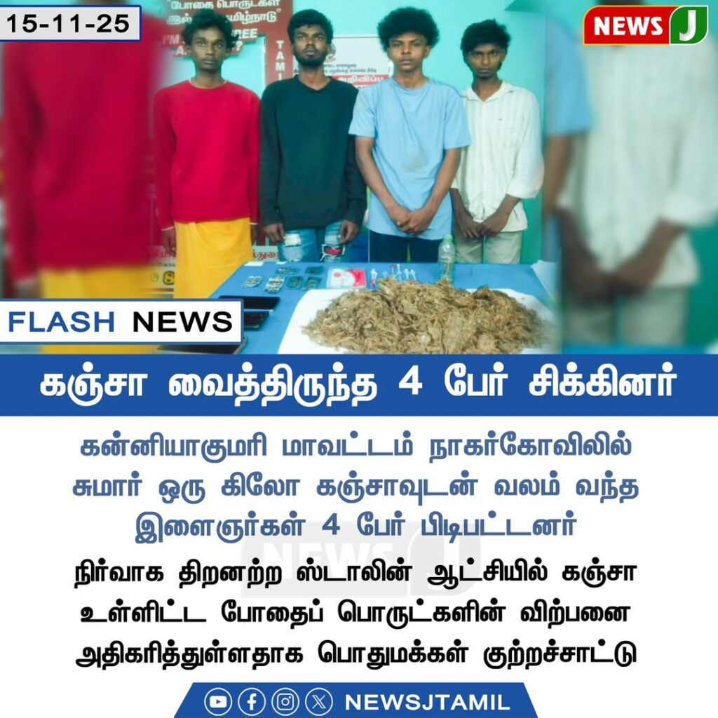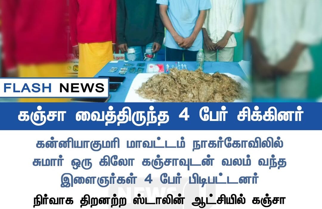 Police have arrested four youths in Nagercoil, Kanyakumari district, for possessing nearly one kilogram of ganja. Officers seized the drugs along with mobile phones and other materials from them.