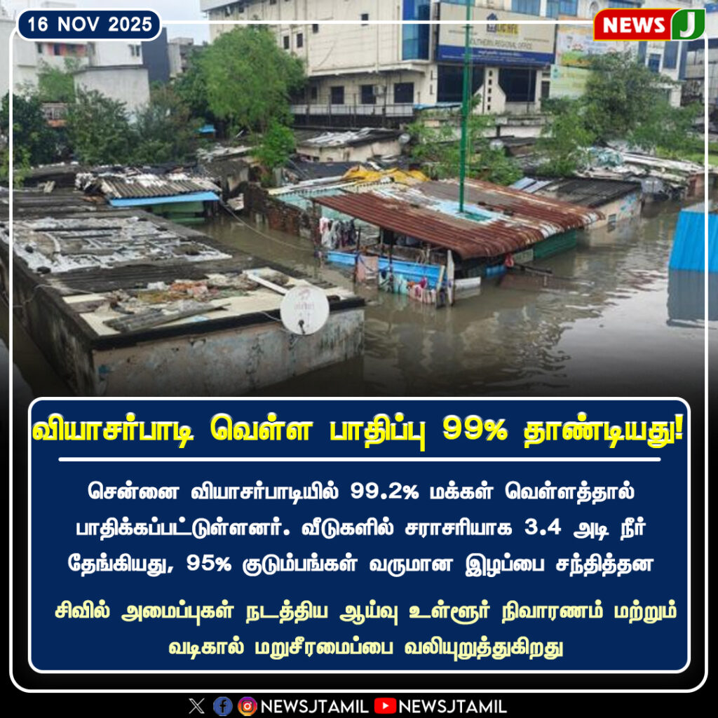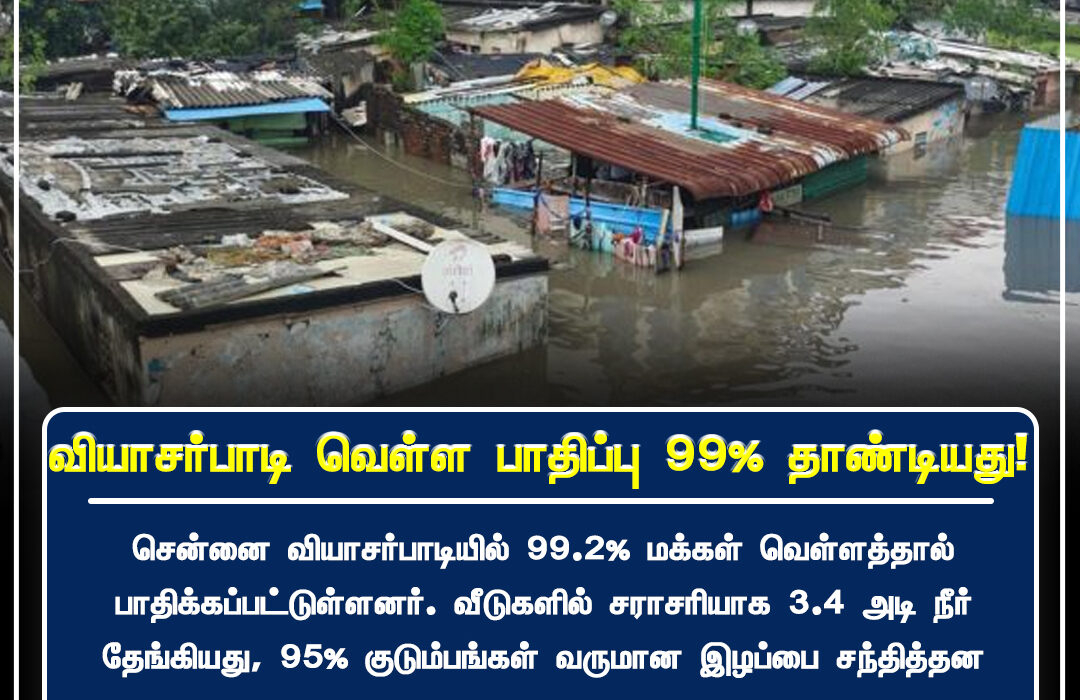 சென்னை வியாசார்பாடி பகுதியில் ஏற்பட்ட கடுமையான மழையால் 99.2% மக்கள் பகுதிகள் வெள்ளத்தால் பாதிக்கப்பட்டதாக அதிகாரிகள் தெரிவித்தனர். வீடுகளுக்குள் 3.4 அடி வரை நீர் தேங்கிய நிலையில், பலரும் தற்காலிக தங்குமிடங்களுக்கு மாற்றப்பட்டனர்.