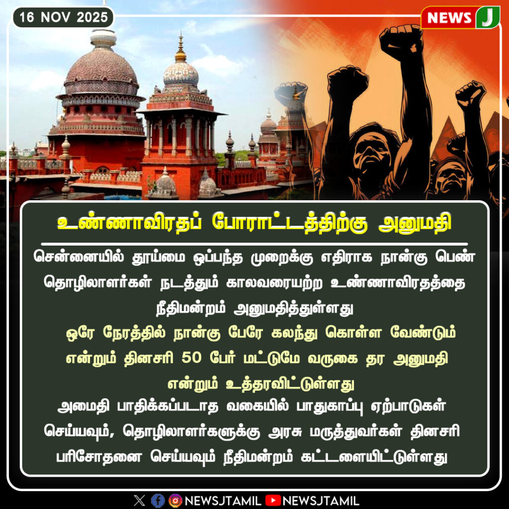 The court in Chennai has granted permission for a group of women workers to conduct an indefinite hunger strike over long-pending demands related to contract-based sanitation work. This decision allows the protesters to voice their concerns through peaceful demonstration.