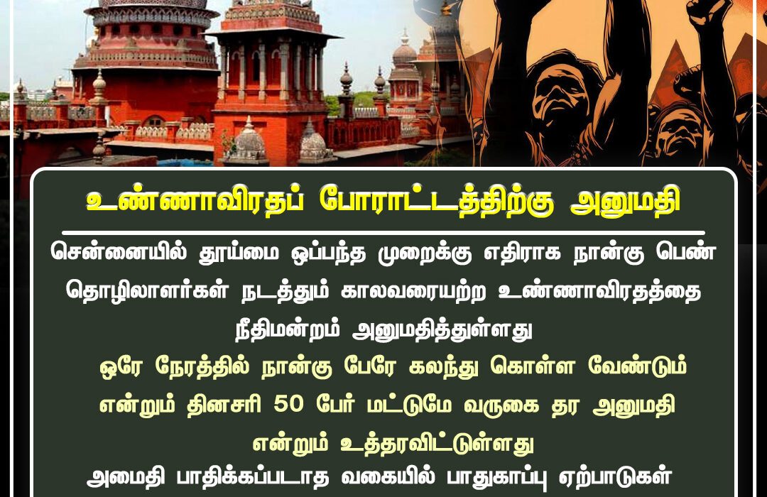 சென்னையில் தூய்மை ஒப்பந்த முறைப்பணி தொடர்பாக நீண்டநாள் கோரிக்கைகளை முன்வைத்து போராடி வந்த பெண்தொழிலாளர்கள் நடத்தும் காலவரையற்ற உண்ணாவிரதப் போராட்டத்திற்கு நீதிமன்றம் அனுமதி வழங்கியுள்ளது. இதன் மூலம் தொழிலாளர்கள் தங்கள் கோரிக்கைகளை அமைதியான முறையில் வெளிப்படுத்த வாய்ப்பு கிடைத்துள்ளது.