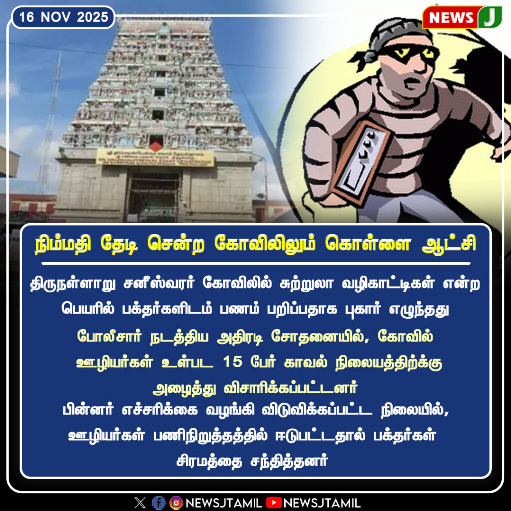 Police are investigating a theft at the Thirunallar Saneeswarar Temple after multiple devotees reported losing cash from their bags. The incident caused significant tension as several people discovered the loss around the same time.