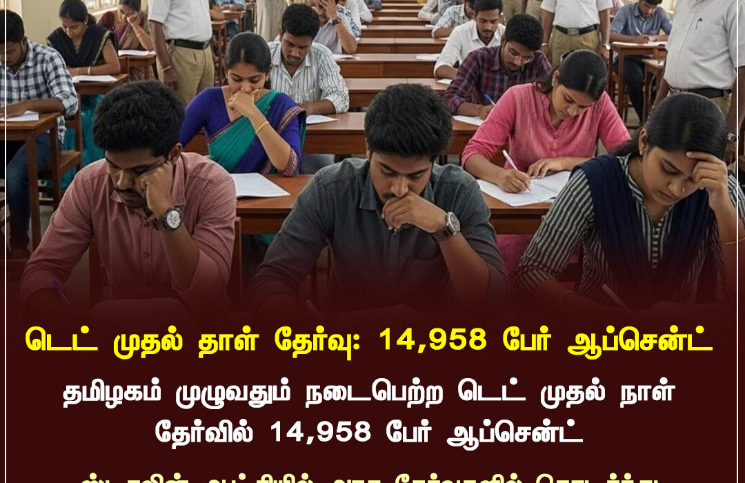 A total of 14,958 candidates were absent on the first day of the Teacher Eligibility Test (TET) conducted across Tamil Nadu, raising concerns among education officials. Many centres reportedly had a high number of empty seats.