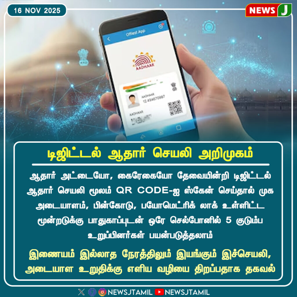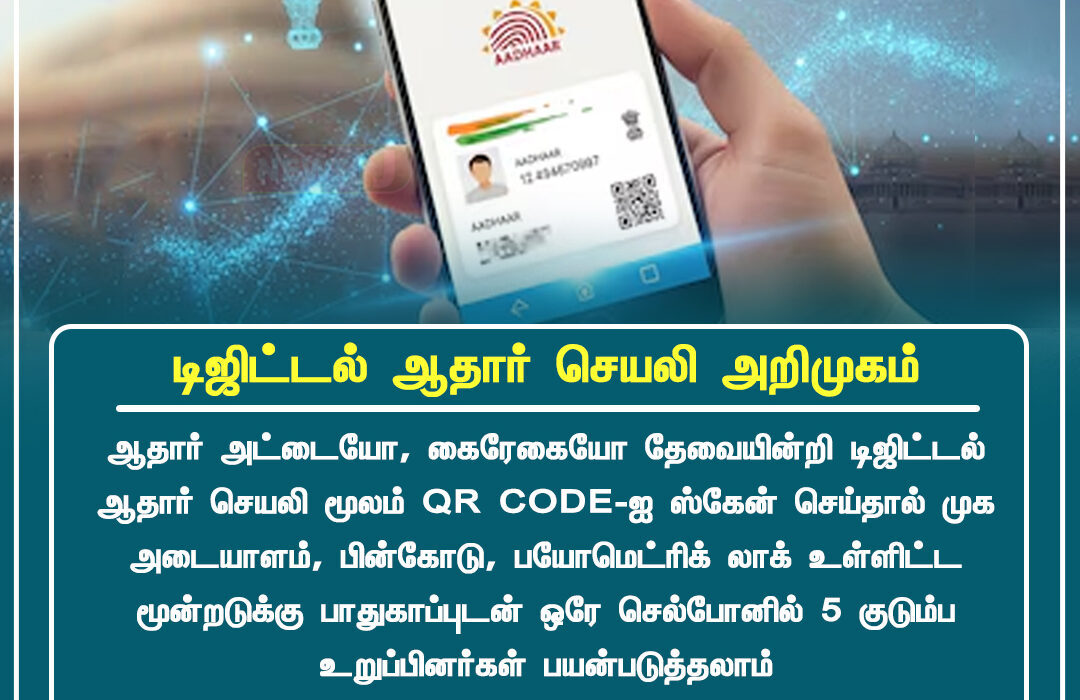 தமிழகம் உட்பட இந்தியா முழுவதும் ஆதார் சேவையை எளிதாக்கும் நோக்கில் டிஜிட்டல் ஆதார் சேலி அறிமுகப்படுத்தப்பட்டுள்ளது. ஆதார் அட்டை அல்லது கைரேகை தேவையின்றி, டிஜிட்டல் ஆதார் சேவியில் QR CODE-ஐ ஸ்கேன் செய்தால் முக அடையாளம், பின்கோடு, பயோமேட்ரிக் லாக் உள்ளிட்ட பாதுகாப்பு அம்சங்கள் ஒரே செயல்பாட்டில் கிடைக்கும் என்று அதிகாரிகள் தெரிவித்துள்ளனர்.