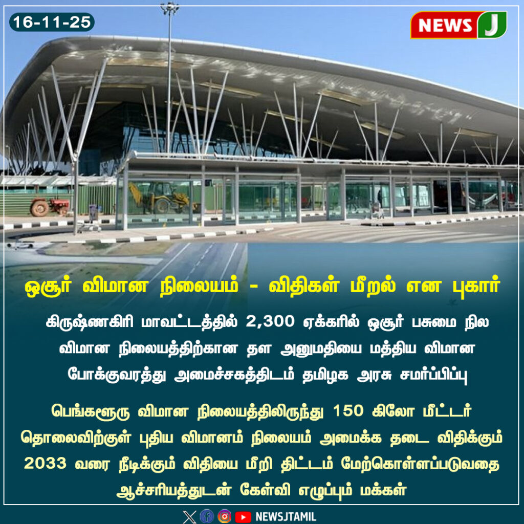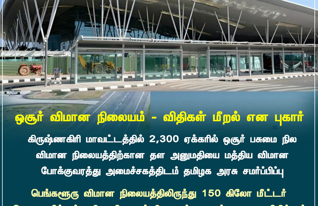 கிருஷ்ணகிரி மாவட்டத்தின் ஒசூரில் 2,300 ஏக்கரில் பசுமை நிலத்தை விமான நிலையத்திற்காக அறிவித்திருப்பது குறித்து மக்கள் கேள்வி எழுப்பியுள்ளனர். மத்திய விமான போக்குவரத்து அமைச்சகத்திடம் தமிழக அரசு சமர்ப்பித்த அறிக்கையில் பல விவரங்கள் தெளிவாக இல்லை எனவும் அவர்கள் கூறுகின்றனர்.