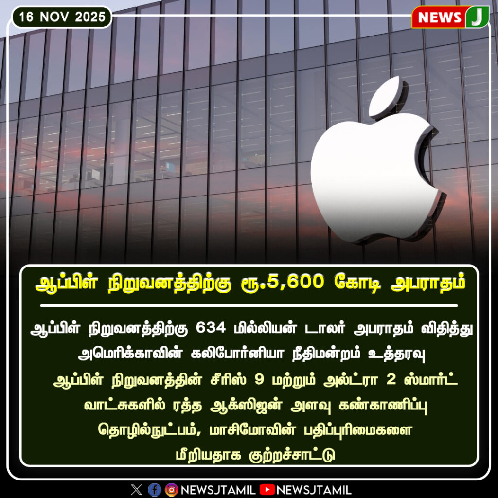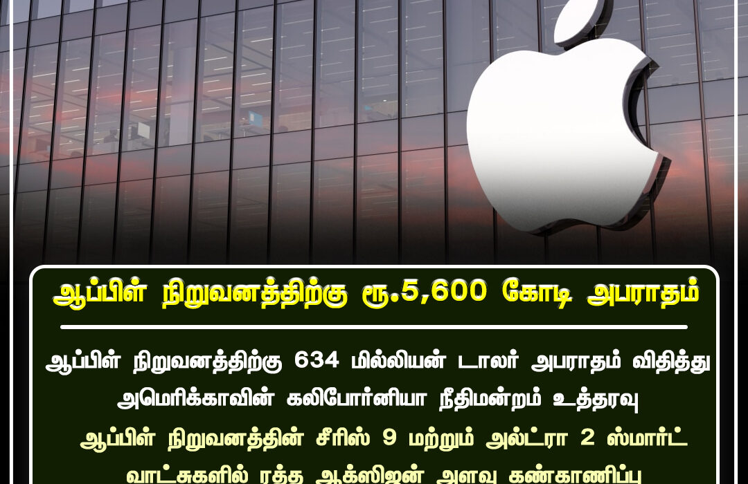 ஆப்பிள் நிறுவனத்திற்கு அமெரிக்காவின் கலிஃபோர்னியா நீதிமன்றம் 634 மில்லியன் டாலர், அதாவது ரூ.5,600 கோடி அபராதம் விதித்துள்ளது.இந்த வழக்கு ஆப்பிள் நிறுவனத்தின் சீரிஸ் 9 மற்றும் அல்ட்ரா 2 ஸ்மார்ட்வாட்சுகளில் ரத்த ஆக்சிஜன் அளவை கண்காணிக்கும் தொழில்நுட்பம் தொடர்பான காப்புரிமை மீறல் குற்றச்சாட்டை அடிப்படையாகக் கொண்டதாக கூறப்படுகிறது.