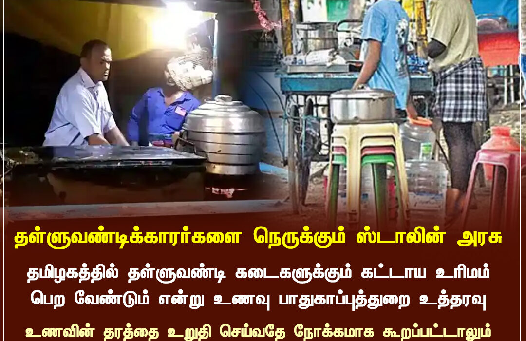 தமிழகத்தில் தள்ளுவண்டி உணவுக் கடைகளுக்கு கட்டாய உரிமம் பெற வேண்டும் என்று உணவு பாதுகாப்புத்துறை உத்தரவு பிறப்பித்துள்ளது. இதன் மூலம் உணவின் தரத்தை உறுதி செய்வதே நோக்கமாக கூறப்பட்டுள்ளாலும், நாள் கூலி வாழ்க்கை வாழும் தள்ளுவண்டிக்காரர்கள் மீது அதிக சுமை ஏற்படுகிறது என மக்கள் கருத்து தெரிவிக்கின்றனர்.