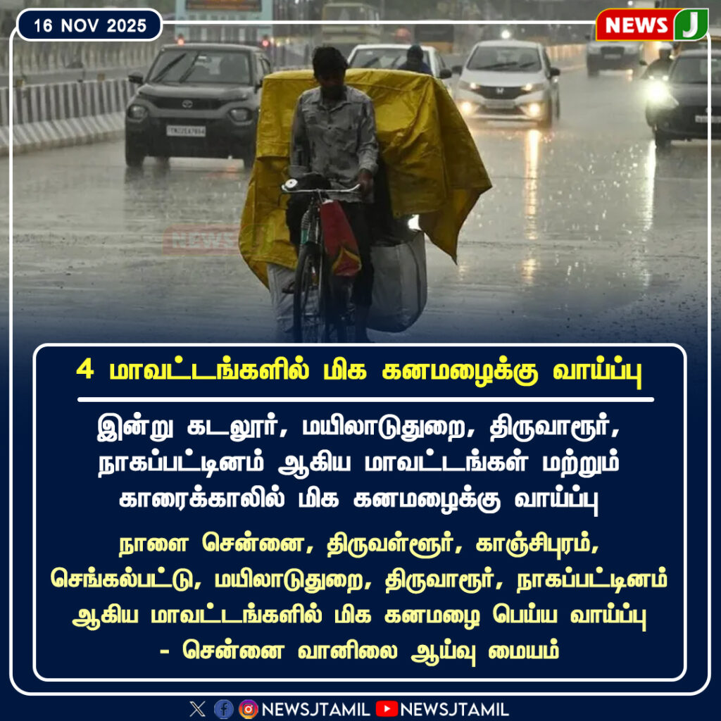 சென்னையைச் சேர்ந்த கடலோர பகுதிகளில் வளிமண்டலச் சுழற்சி காரணமாக இன்று கடலூர், மயிலாடுதுறை, திருவாரூர், நாகப்பட்டினம் ஆகிய மாவட்டங்களில் மிக கனமழை பெய்ய வாய்ப்பு உள்ளது என வானிலை ஆய்வு மையம் அறிவித்துள்ளது.