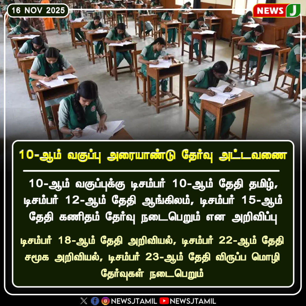 Class 10 half-yearly exams across Tamil Nadu are scheduled to begin on December 10, according to the School Education Department. The Tamil exam will be held on December 10, followed by the English exam on December 12 and the Mathematics exam on December 15.