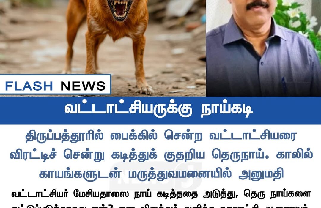 A Tahsildar traveling to his office in Tirupathur district was suddenly attacked by a stray dog while on a bike, resulting in a bite injury on his leg. He was immediately taken to a nearby hospital where he received medical treatment, including anti-rabies vaccination.