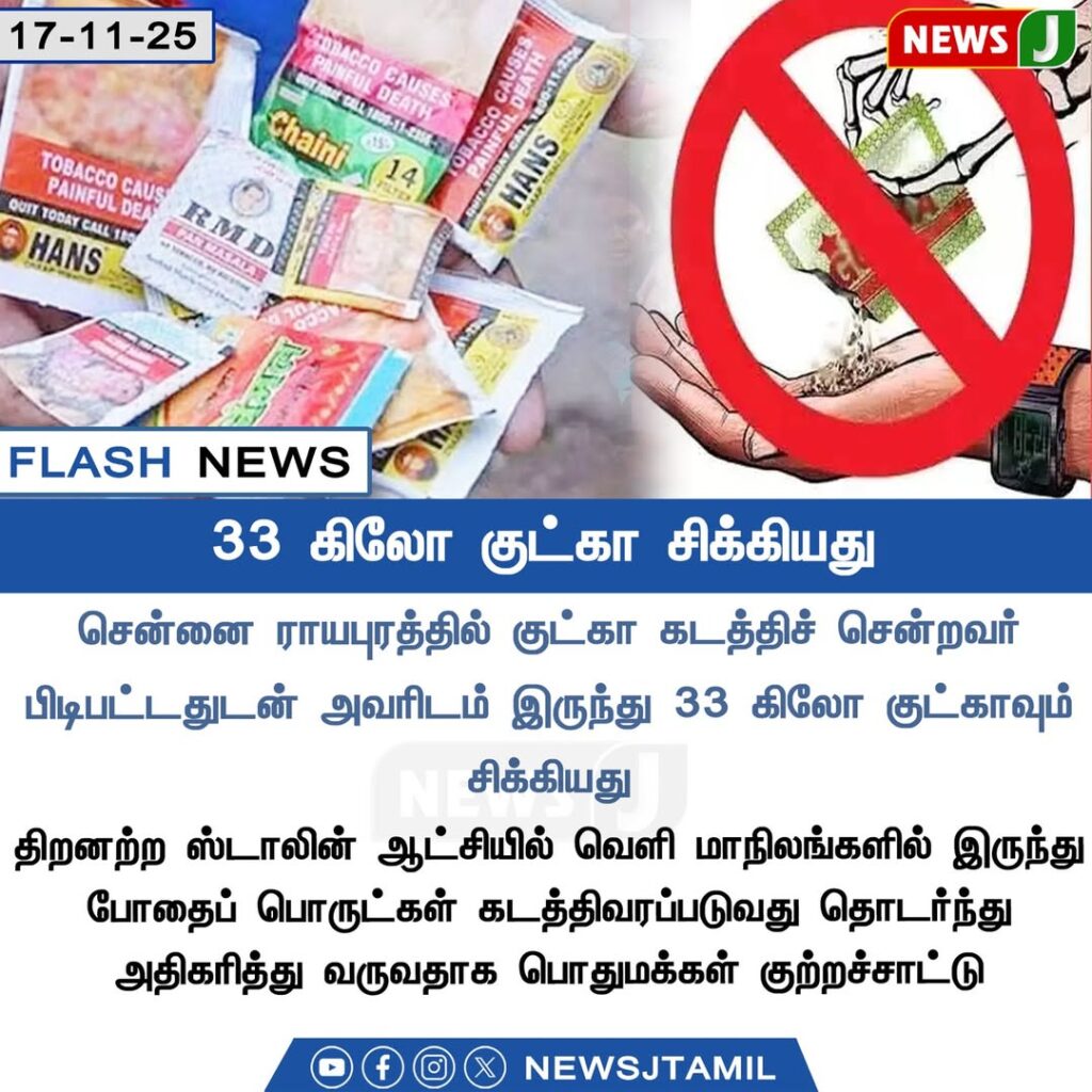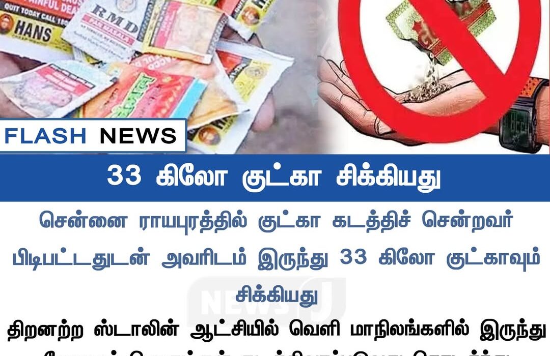 Police in Royapuram, Chennai, seized 33 kg of banned gutka during a surprise inspection at a suspected storage location. Despite the statewide ban, the products were stocked illegally for distribution.