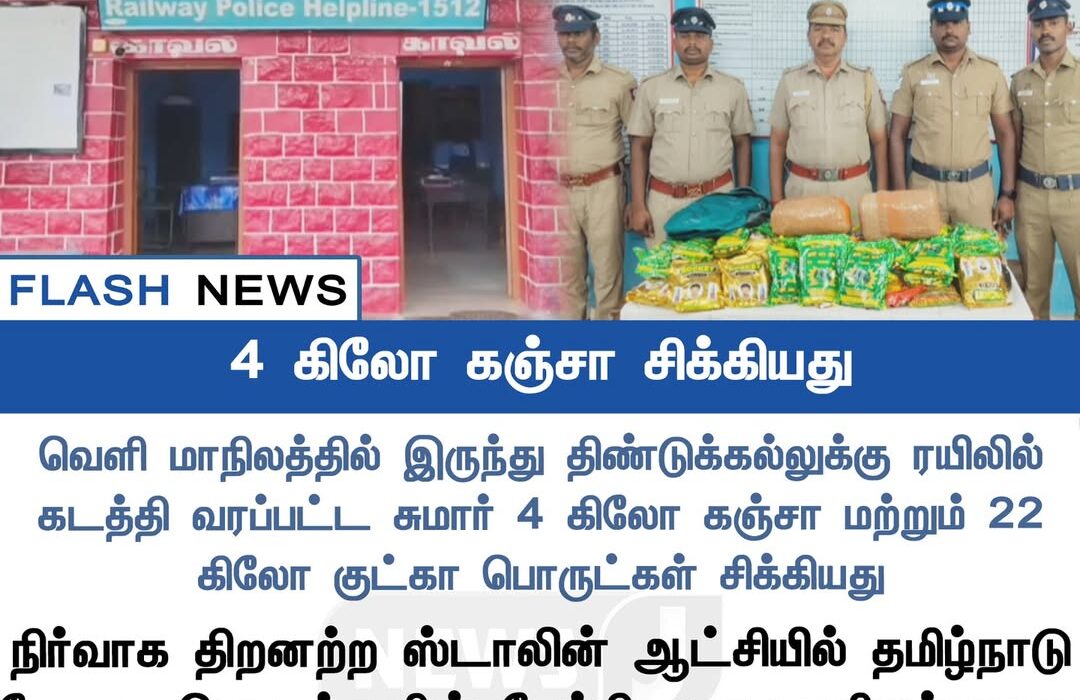 Railway police at Dindigul seized 4 kg of ganja and 22 kg of banned gutka packets that were being smuggled into Tamil Nadu through an outbound train. The contraband was found during inspections of suspicious luggage.