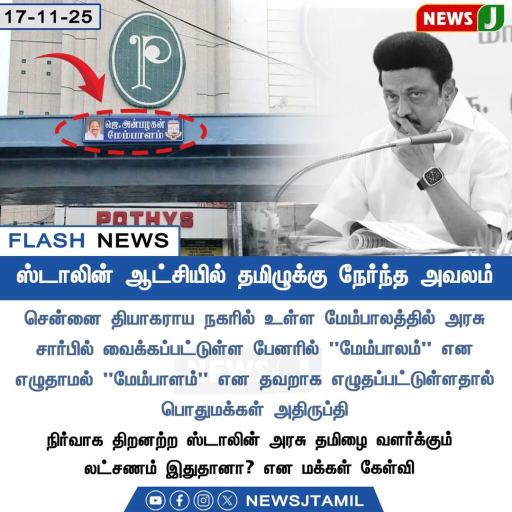 A nameboard error on a government-installed flyover signboard in T. Nagar, Chennai, sparked widespread concern among the public. Instead of correctly displaying the Tamil word for “flyover,” an incorrect version appeared, drawing attention both offline and online.