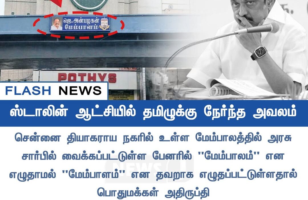 சென்னை தியாகராயா நகரில் உள்ள மேம்பாலத்தில் அரசு சார்பில் வைக்கப்பட்டிருந்த பெயர்ப்பலகையில் “மேம்பாலம்” என எழுத வேண்டிய இடத்தில் தவறாக “மேம்பாலம்” என்பதற்குப் பதிலாக வேறு சொல்லாக்கம் இடம்பெற்றது. இந்த தவறு மக்களின் கவனத்தை ஈர்த்து சமூக வலைதளங்களில் பெரும் விவாதமாக மாறியுள்ளது.