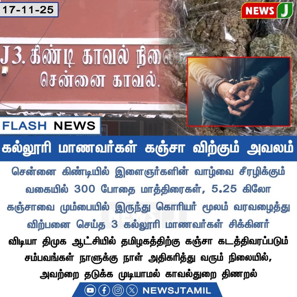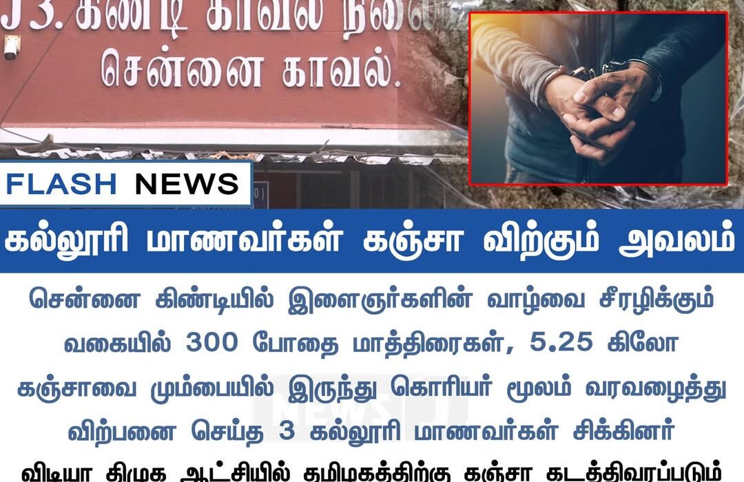 சென்னை கிண்டி பகுதியில் இளைஞர்களின் வாழ்வை சீரழிக்கும் வகையில் 300 போதை மாத்திரைகள் மற்றும் 5.25 கிலோ கஞ்சாவை கொள்முதல் செய்து விற்பனை செய்ததாக மூன்று கல்லூரி மாணவர்கள் போலீசாரால் கைது செய்யப்பட்டனர். இந்த போதைப் பொருட்கள் கொரியர் மூலம் வந்ததாக விசாரணையில் தெரியவந்துள்ளது.