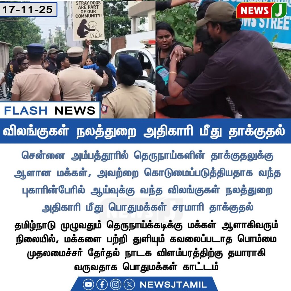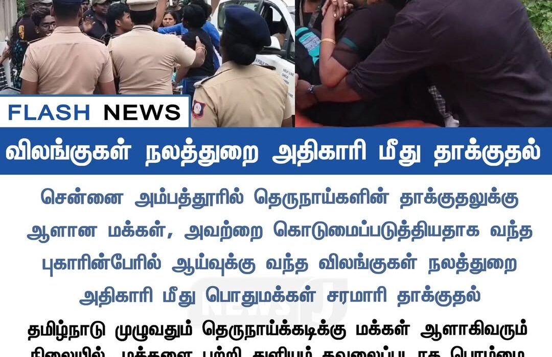 In Ambattur, Chennai, tension escalated during a dispute related to stray dog attacks, leading to an alleged assault on an animal welfare officer who had arrived for an inspection. The situation caused unrest in the locality.