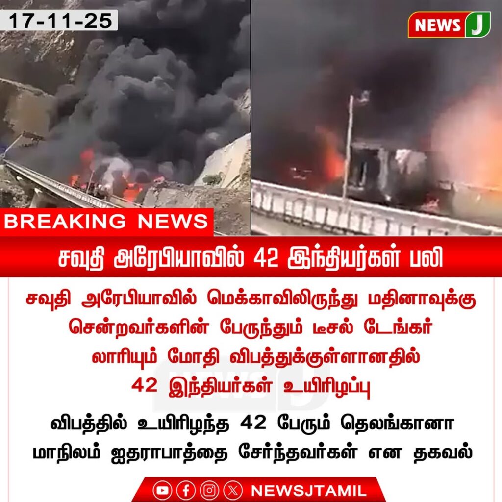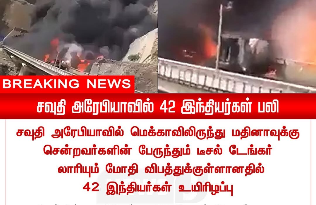 சவுதி அரேபியாவின் மக்கா நோக்கி பயணம் செய்திருந்த தொழிலாளர்கள் கொண்ட பேருந்து, திடீரென தீப்பிடித்ததில் 42 இந்தியர்கள் உயிரிழந்ததாக ஆரம்ப தகவல்கள் தெரிவிக்கின்றன. லாரியுடன் மோதிய பின்னர் தீ வெடித்ததாக கூறப்படுகிறது.