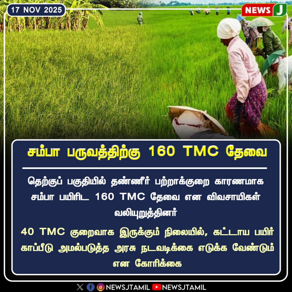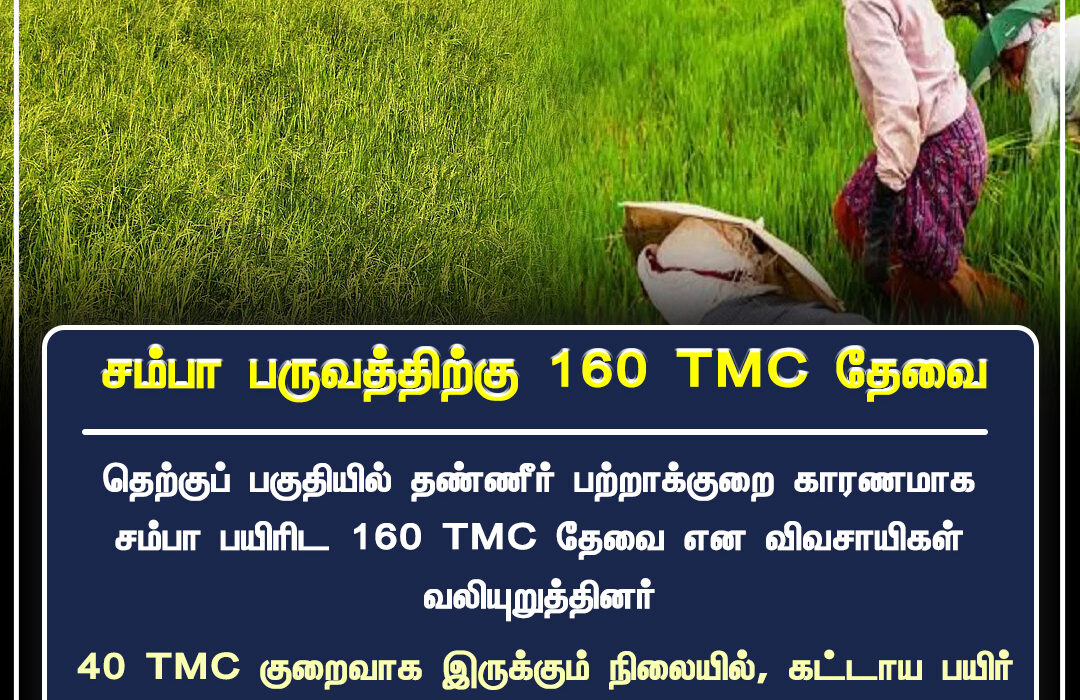 Farmers in the southern region have stated that at least 160 TMC of water is required for Samba cultivation due to severe water scarcity. The current storage level is too low, affecting agricultural activities.