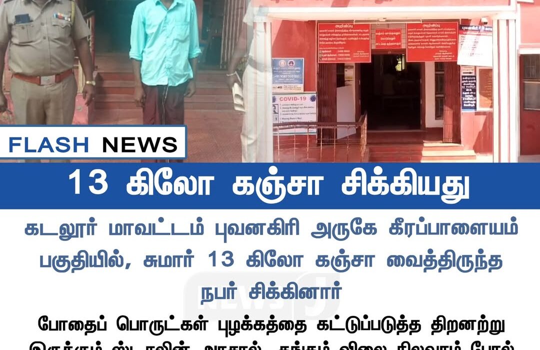 Police in Cuddalore district arrested a man near Bhuvanagiri after recovering around 13 kilograms of ganja from his possession. The seizure was made during a routine check when the suspect’s movements raised suspicion.