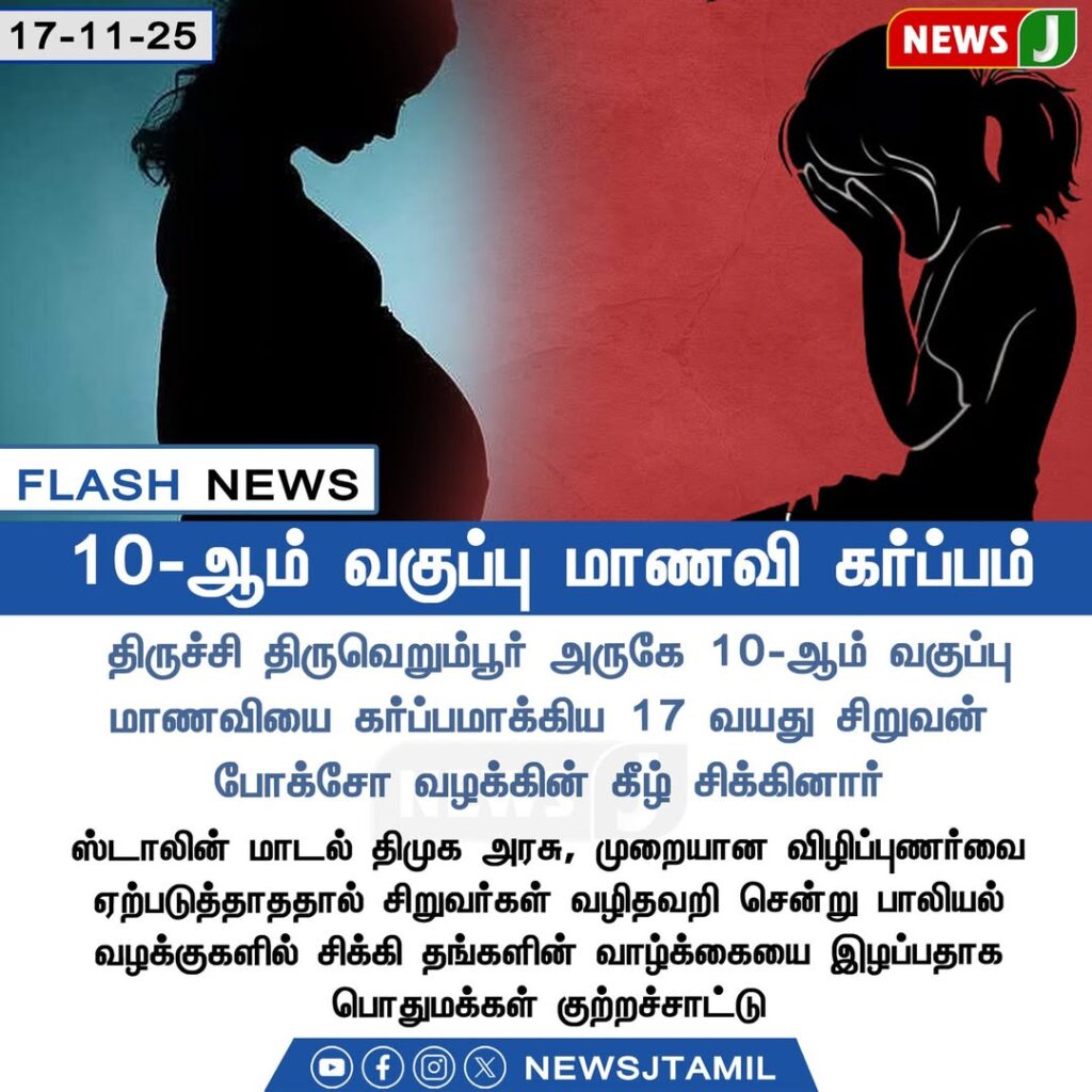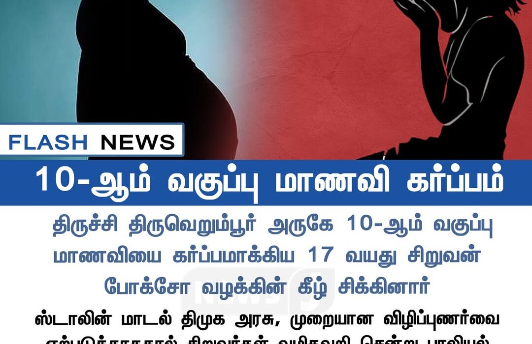A 10th-grade girl from Thiruvembur, Trichy, was found to be pregnant, leading to the arrest of a 17-year-old boy. Police initiated action based on a complaint filed by the girl’s family.