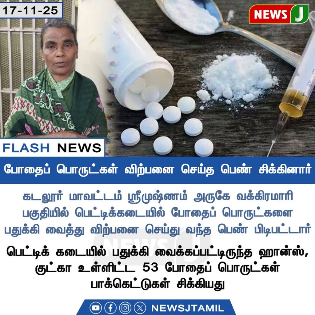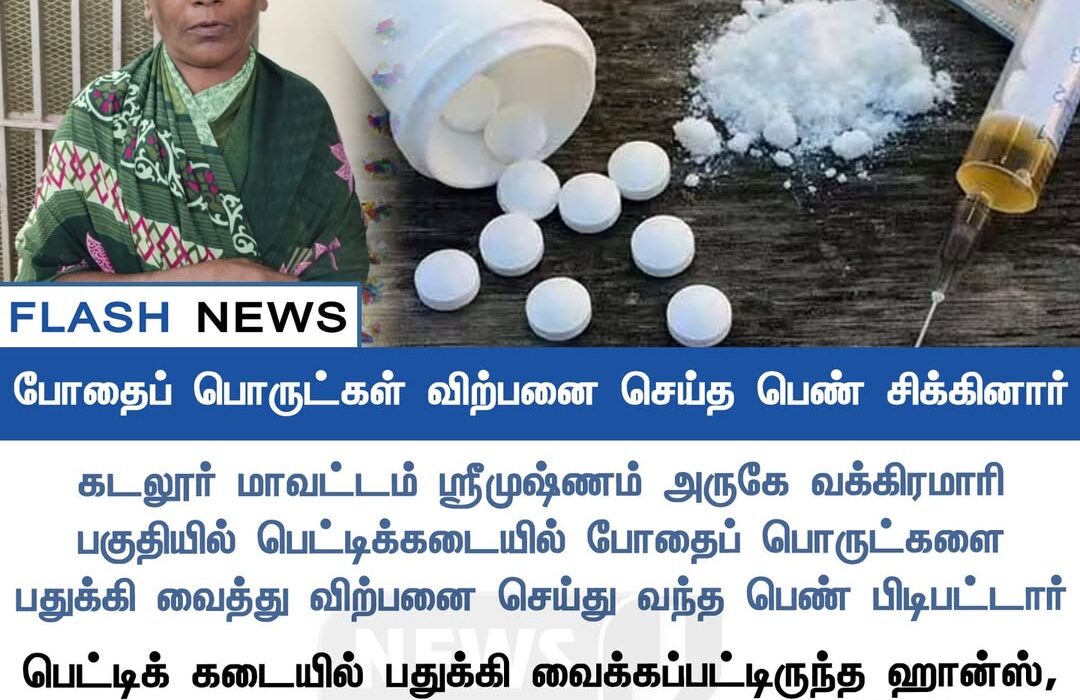 Police in the Cuddalore district have arrested a woman who was allegedly selling illegal substances from a small petty shop in Srimushnam. The arrest was made following a tip-off received by the authorities.