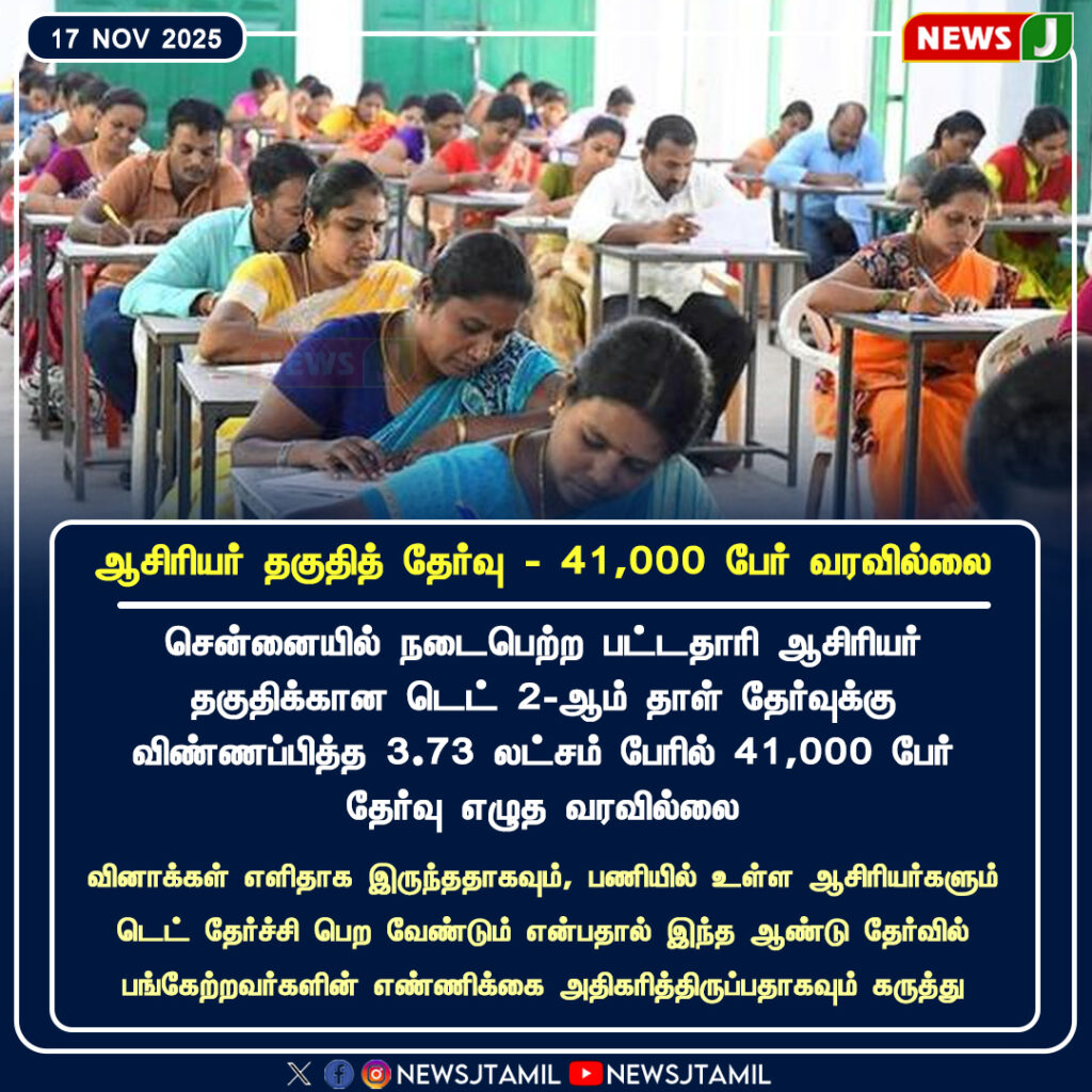 In Chennai, the Graduate Teacher Eligibility Test (TET Paper 2) recorded a high absentee rate, with 41,000 of the 3.73 lakh registered candidates skipping the exam. Many centers reported large numbers of empty seats.