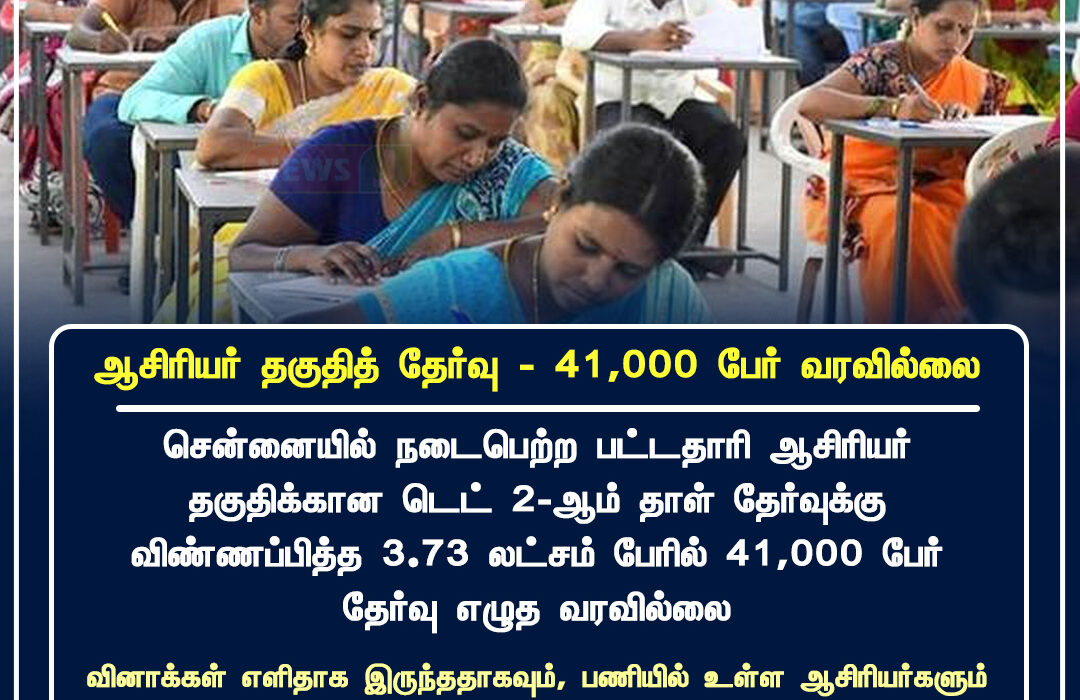 சென்னையில் நடைபெற்ற பட்டதாரி ஆசிரியர் தகுதிக்கான டெட் 2–ஆம் தாள் தேர்வுக்கு விண்ணப்பித்த 3.73 லட்சம் பேரில் 41,000 பேர் தேர்வுக்கு வராதது தேர்வு மையங்களில் அதிர்ச்சியை ஏற்படுத்தியது. பல மையங்களில் காலியாக இருந்த இருக்கைகள் கவனத்தை ஈர்த்தன.