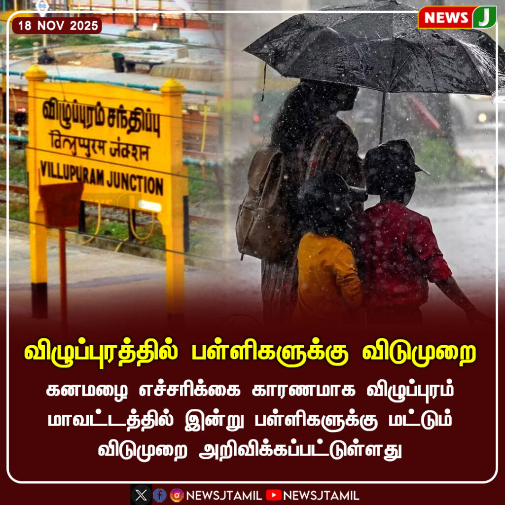 விழுப்புரம் மாவட்டத்தில் தொடர்ந்து பெய்து வரும் கனமழையால், இன்றைய தினம் பள்ளிகளுக்கு மட்டும் விடுமுறை அறிவிக்கப்பட்டுள்ளது. காலை நேரத்திலேயே பல பகுதிகளில் மழை தீவிரமடைந்ததால், மாணவர்கள் பாதுகாப்பை கருத்தில் கொண்டு இந்த முடிவு எடுக்கப்பட்டது.