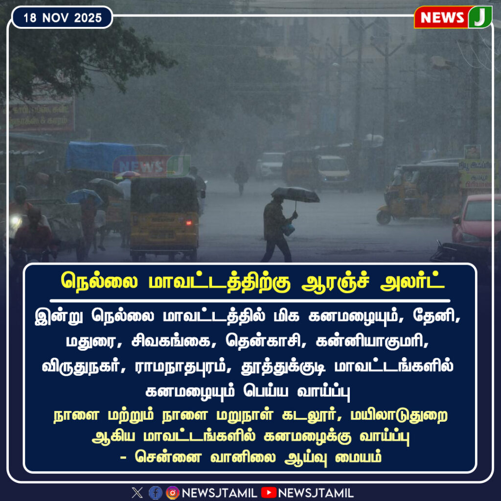 Heavy rainfall has been forecast for Tirunelveli district today due to active weather conditions, according to the Chennai Meteorological Center. Districts including Theni, Madurai, Sivagangai, Tenkasi, and Kanniyakumari are also expected to receive significant showers.