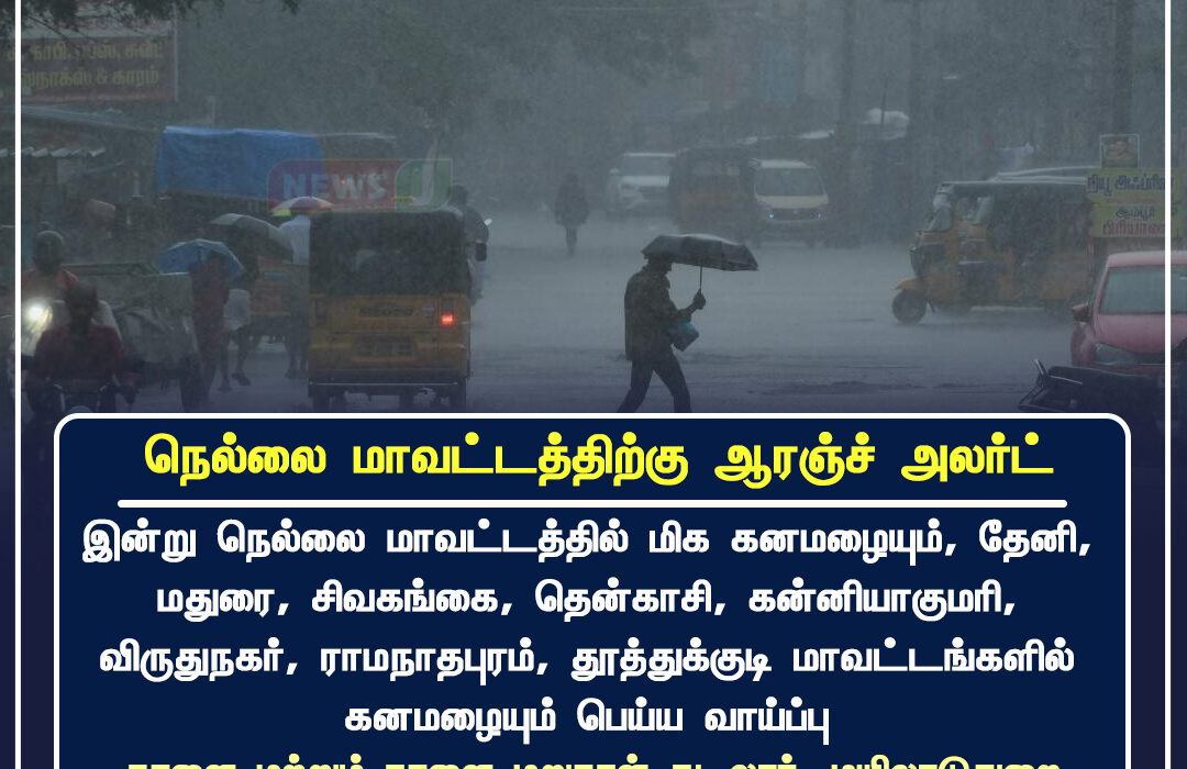 இன்று திருநெல்வேலி மாவட்டத்தில் தொடர்ந்து கனமழை பெய்யக்கூடும் என வானிலை ஆய்வு மையம் எச்சரிக்கை வெளியிட்டுள்ளது. தேனி, மதுரை, சிவகங்கை, தென்காசி, கன்னியாகுமரியும் மழை தாக்கம் அதிகரிக்கும் பகுதிகளாக குறிப்பிடப்பட்டுள்ளன.