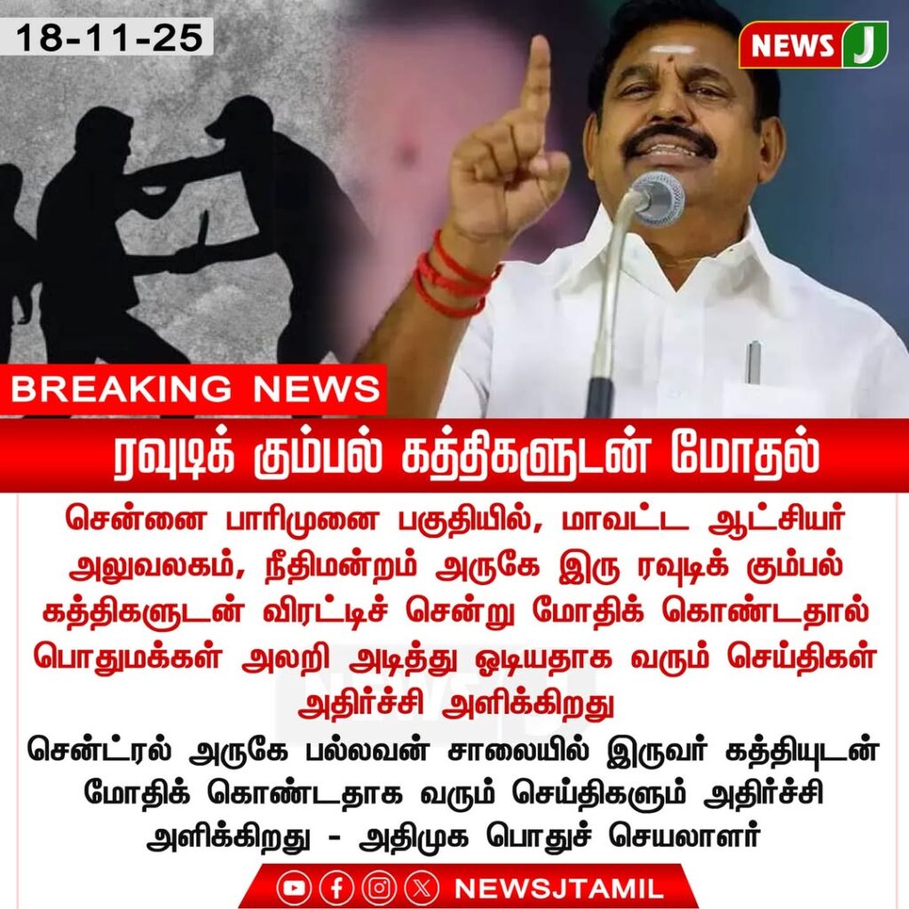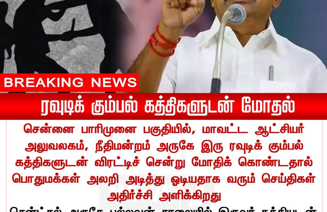 சென்னை பாமரப்பகுதியில் மாவட்ட ஆட்சியர் அலுவலகம் மற்றும் நீதிமன்றம் அருகே இரு ரவுடி கும்பல்கள் திடீரென கத்திகளுடன் மோதிக்கொண்டதால் அப்பகுதியில் பெரும் பரபரப்பு ஏற்பட்டது. மக்கள் பதற்றத்துடன் சாலைகளில் ஓடி தஞ்சம் அடைந்தனர்.