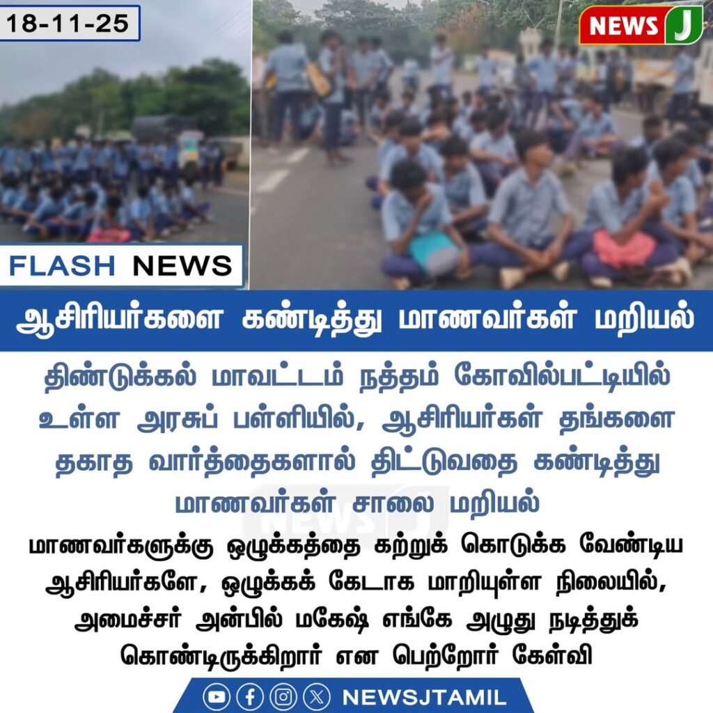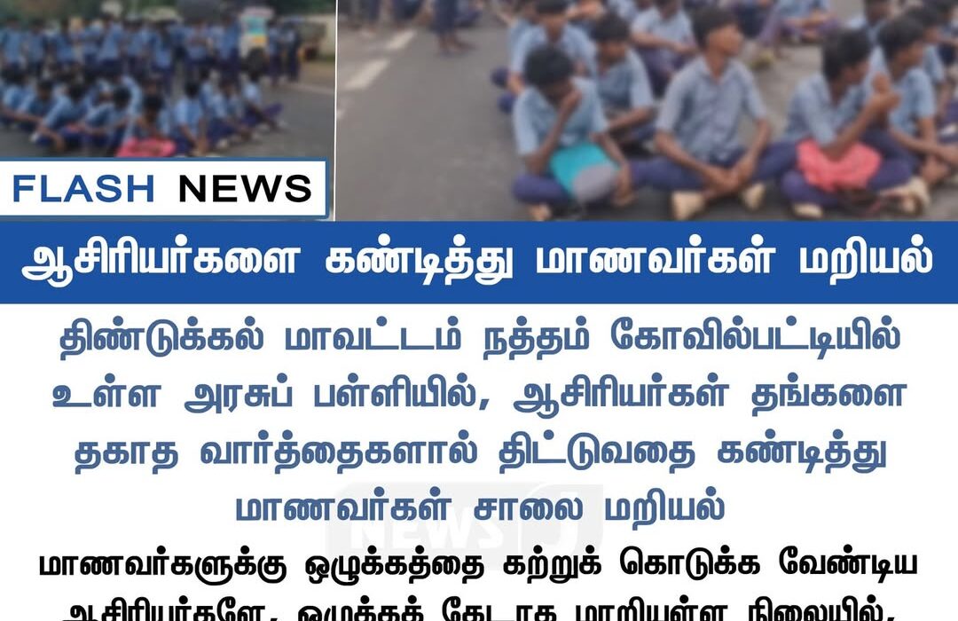 In Dindigul district’s Natham Kovilpatti government school, students alleged that teachers verbally abused and insulted them. Following this, the students walked out of the campus and staged a road blockade.