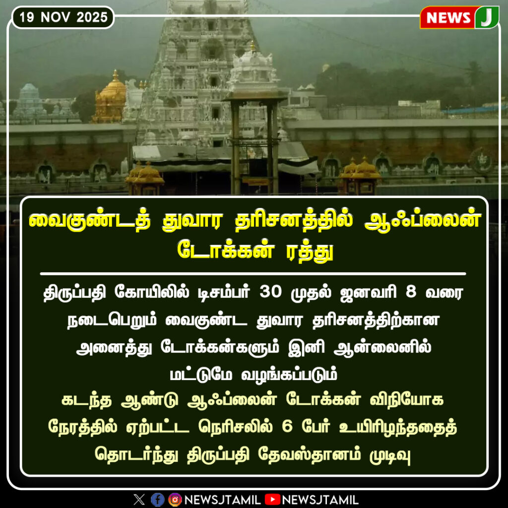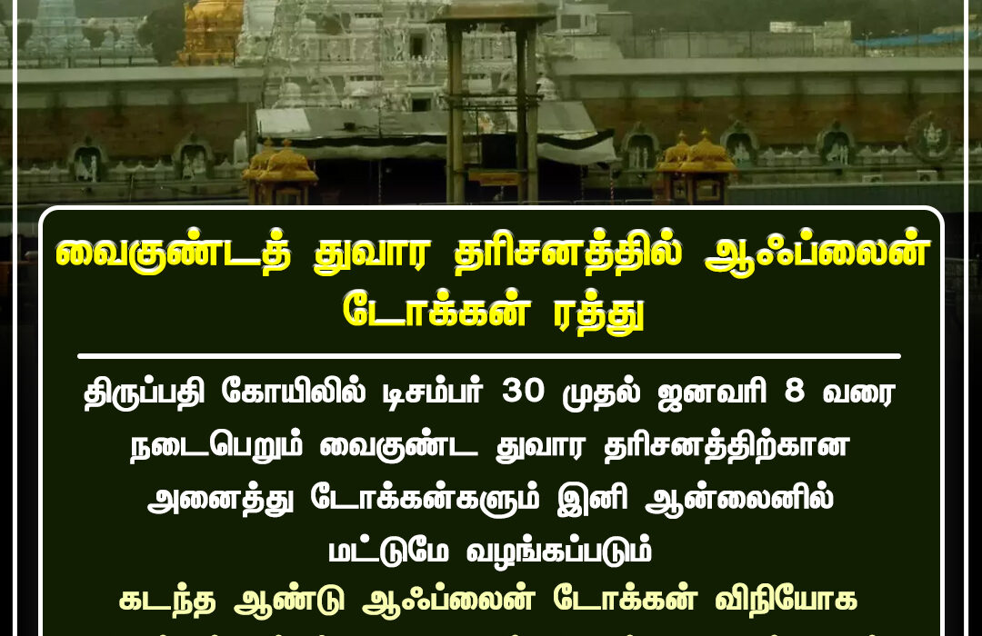 திருப்பதி கோயிலில் டிசம்பர் 30 முதல் ஜனவரி 8 வரை நடைபெறும் வைகுண்ட ஏகாதசி துவார தரிசனத்திற்கான அனைத்து ஆஃப்லைன் டோக்கன்களும் இப்போது ரத்து செய்யப்பட்டுள்ளன. அதிக நெரிசல், பாதுகாப்பு முன்னெச்சரிக்கை மற்றும் கூட்ட மேலாண்மை காரணமாக இந்த முடிவு எடுக்கப்பட்டுள்ளதாக தகவல்.