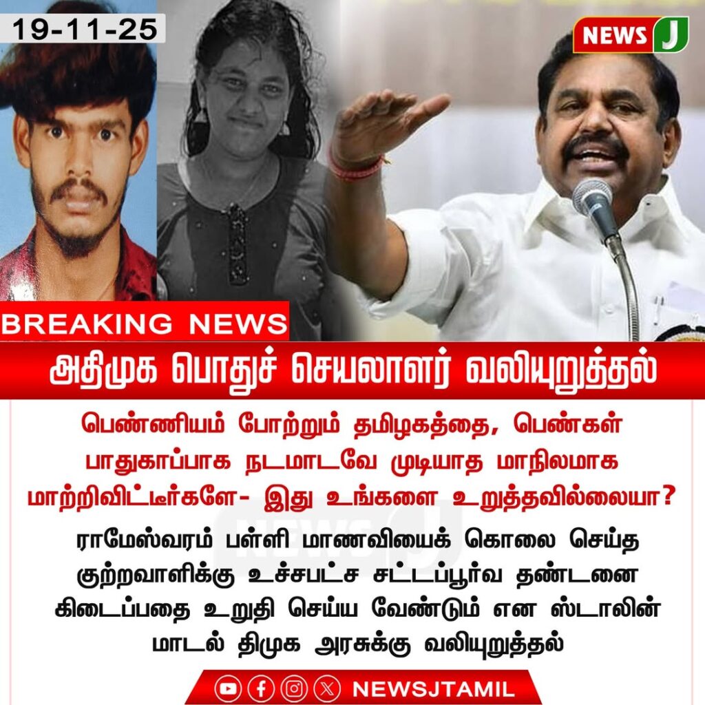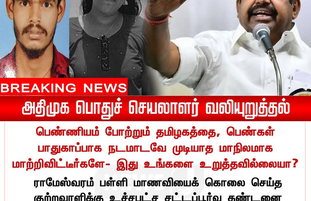 ADMK General Secretary has strongly condemned the brutal murder of a schoolgirl, calling it a shocking failure of Tamil Nadu’s law and order under the current DMK government. He questioned how women and children can remain safe when crimes of this magnitude keep occurring.