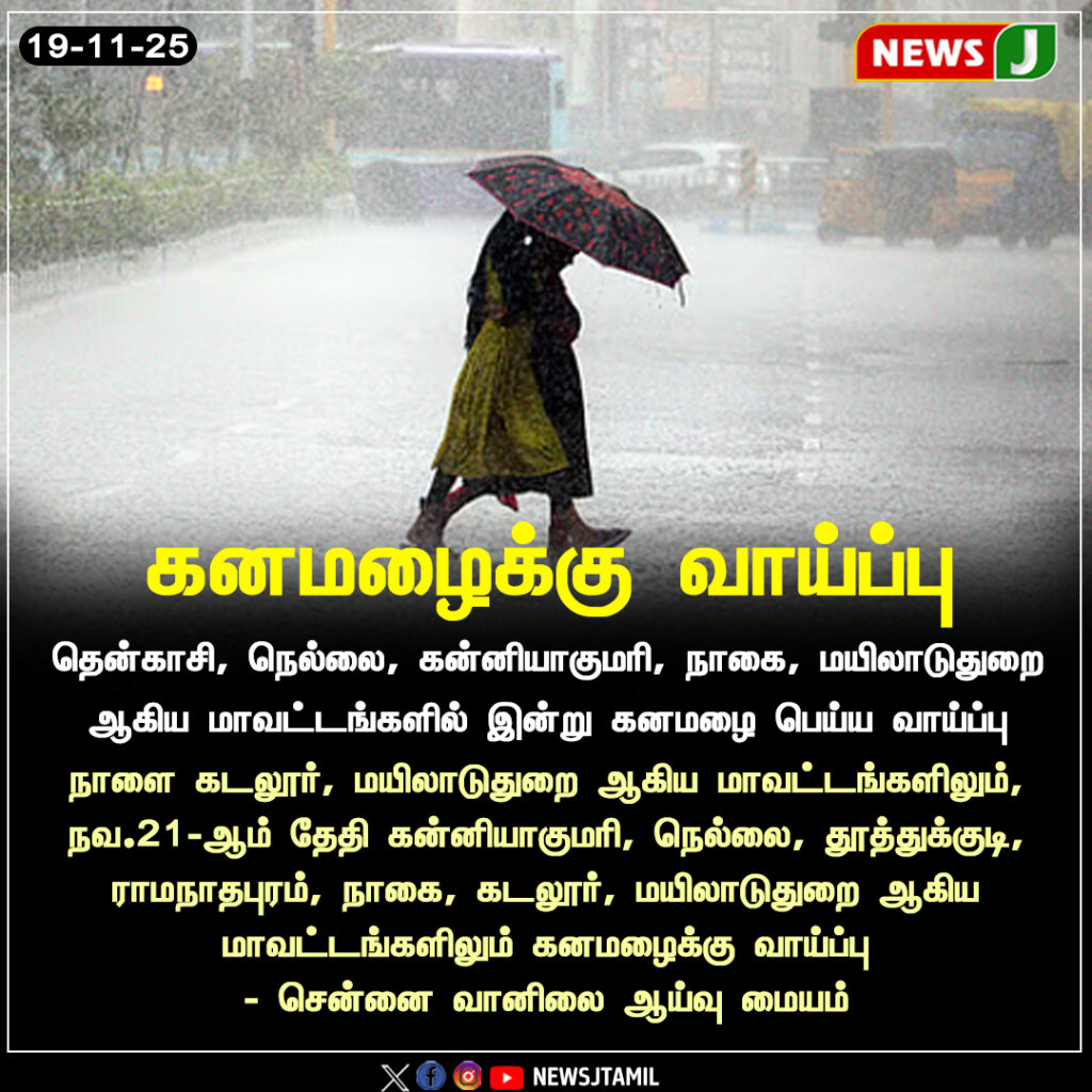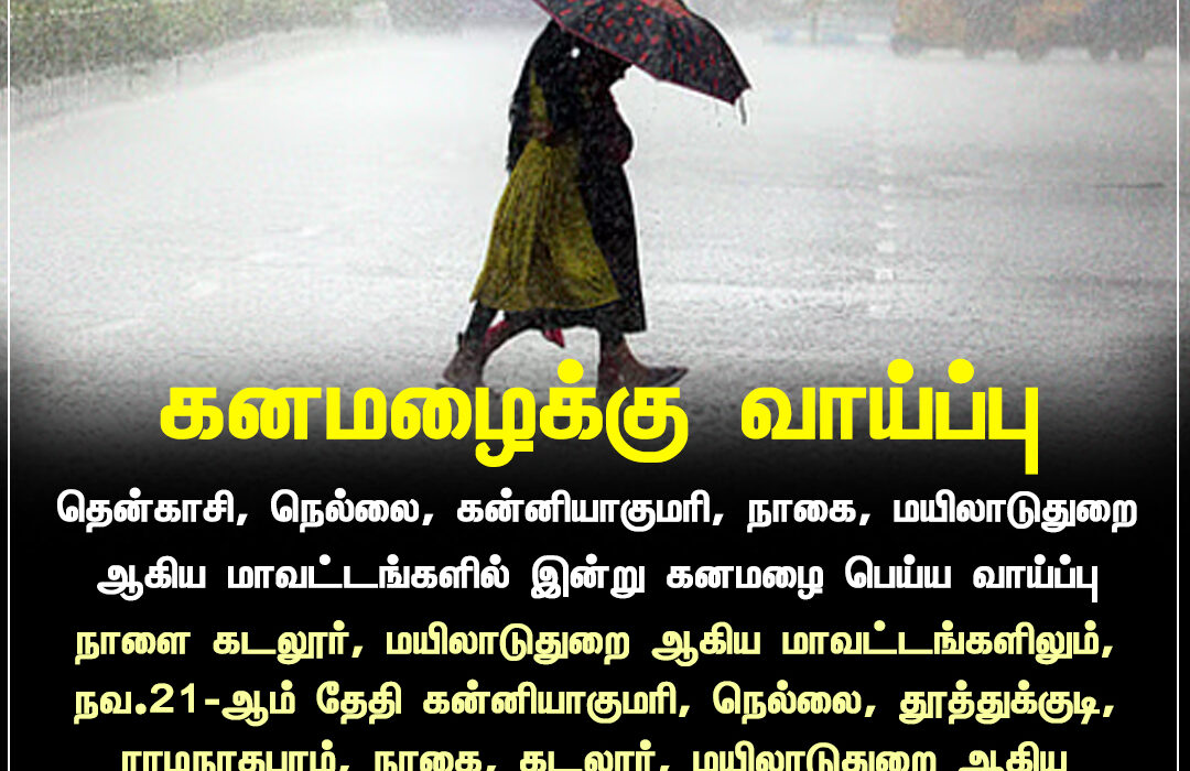 From tomorrow (Nov 21), heavy rains are also likely in Kanyakumari, Tirunelveli, Thoothukudi, Ramanathapuram, Nagapattinam, Cuddalore and Mayiladuthurai. The weather office has cautioned the public to stay alert and follow safety instructions as the rainfall activity may continue for the next two days.