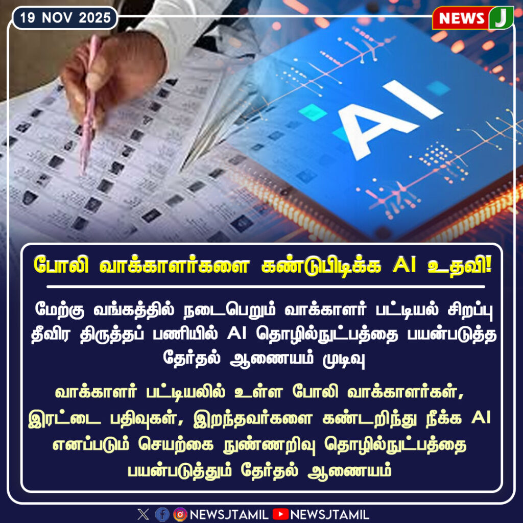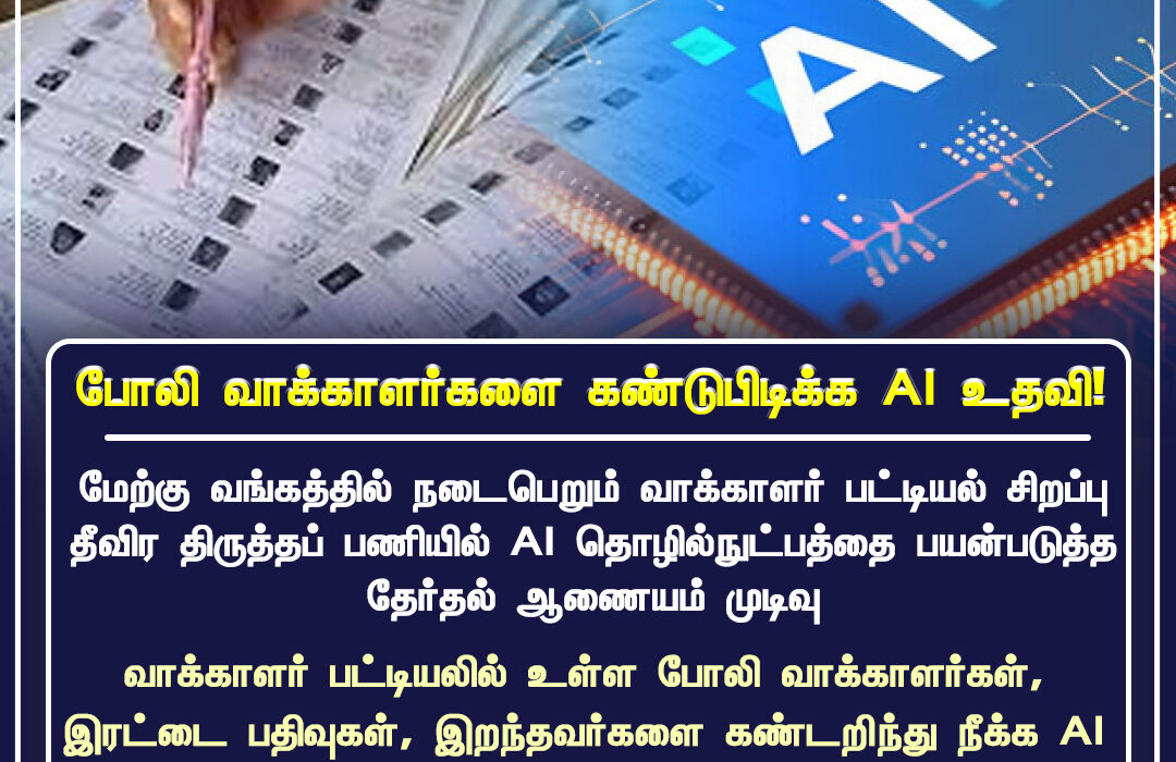 நாடு முழுவதும் நடைபெறும் வாக்காளர் பட்டியல் சிறப்பு தீவிர திருத்தப் பணியில், போலி வாக்காளர்களை கண்டுபிடிக்க செயற்கை நுண்ணறிவு (AI) தொழில்நுட்பம் பயன்பாட்டுக்கு வருவதால் தேர்தல் பணிகள் மேலும் துல்லியமாக நடைபெற உள்ளன. வாக்காளர் பட்டியலில் ஒரே நபரின் பல புகைப்படங்கள், இரட்டைப் பதிவுகள், இருப்பிட வேறுபாடுகள் ஆகியவற்றை AI மிகத் துல்லியமாக ஒப்பிட்டு கண்டறியும்.