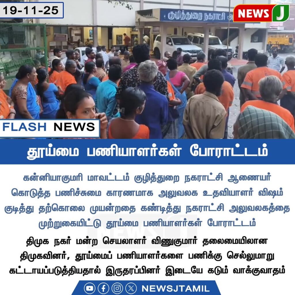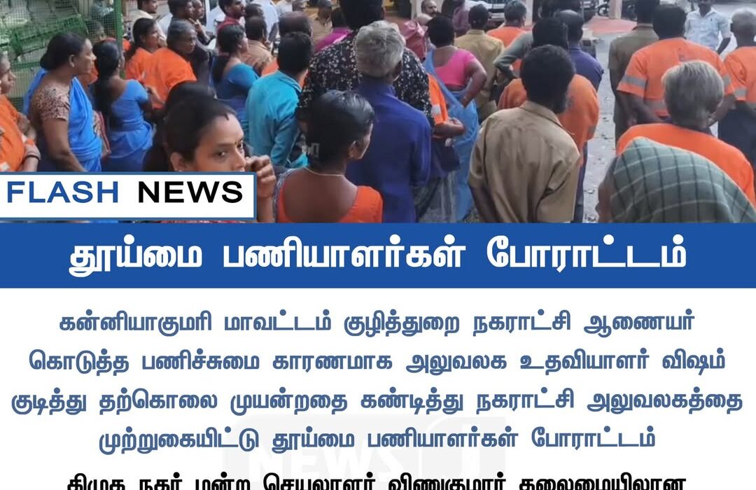 Protest erupted in Kanyakumari district as sanitation workers surrounded the municipal office after a staff member allegedly attempted suicide due to excessive workload and administrative pressure.