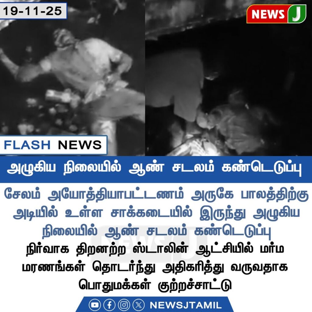 செலத்தின் அருகே பாலத்திற்குட்பட்ட அடியிலுள்ள சாக்கடை பகுதியில் அழுகிய நிலையில் இருந்த ஒரு ஆண் சடலம் இன்று காலை கண்டெடுக்கப்பட்டதால் பரபரப்பு ஏற்பட்டது. சம்பவம் குறித்து உடனடியாக தகவல் பெறப்பட்ட போலீசார்现场க்கு சென்றனர்.