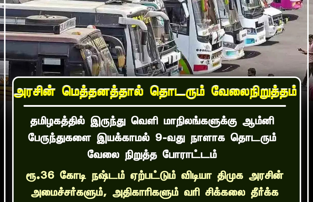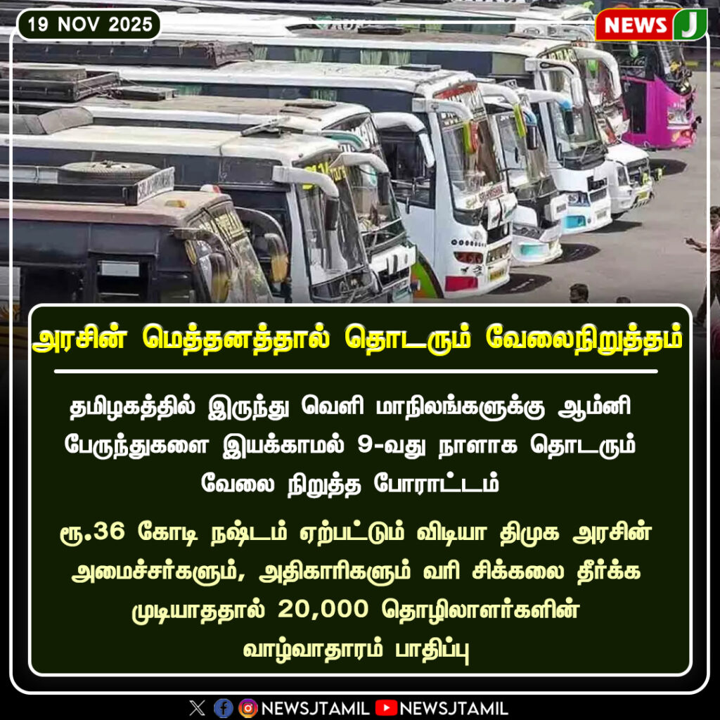 In Tamil Nadu, the omni bus strike continues for the ninth consecutive day, severely affecting inter-state travelers. Operators insist that the strike will not be withdrawn until the government addresses fare revision and regulatory issues.
