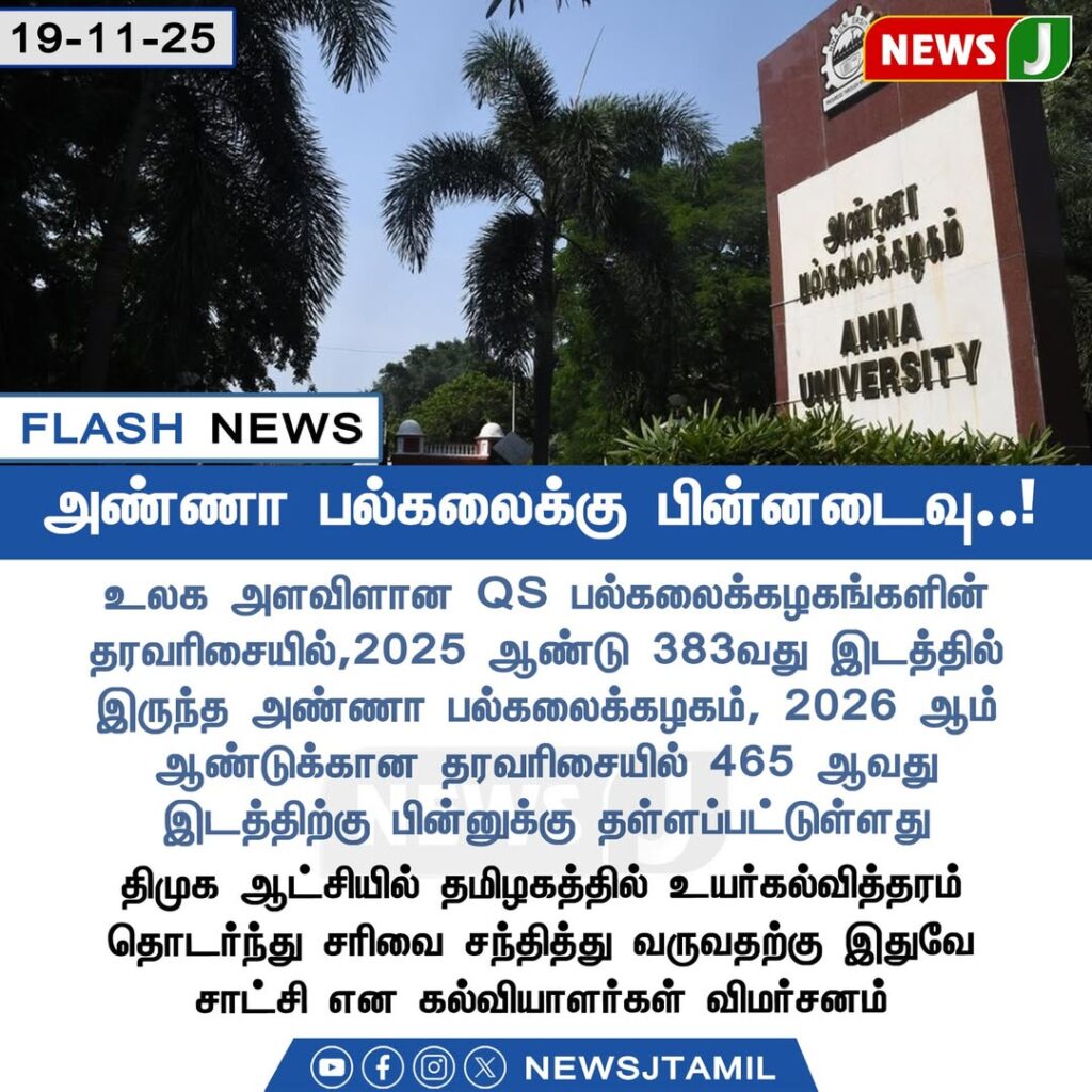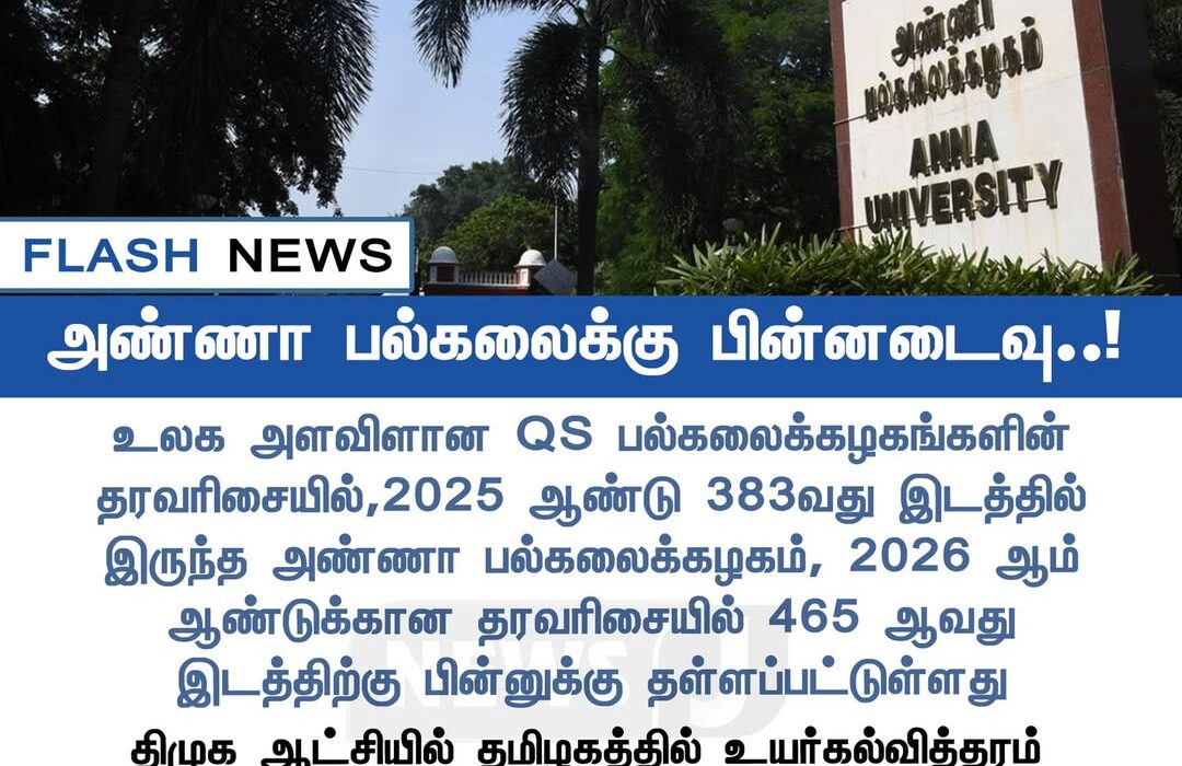 சர்வதேச QS பல்கலைக்கழக தரவரிசையில், அண்ணா பல்கலைக்கழகம் 2025 ஆம் ஆண்டு 383வது இடத்தில் இருந்த நிலையில், 2026 தரவரிசையில் 465வது இடத்துக்குத் தள்ளப்பட்டுள்ளது. இது கல்வித்துறையில் பெரும் கவனத்தை ஈர்த்துள்ளது.