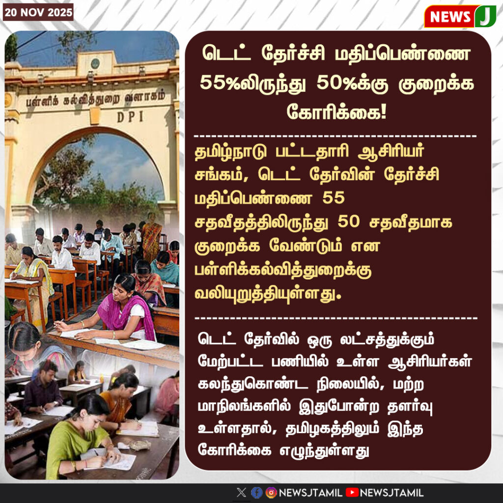 Tamil Nadu Graduate Teachers’ Association has requested the state education department to reduce the TET qualifying mark from the existing 55% to 50%. With thousands of teacher vacancies remaining unfilled across districts, the association argues that lowering the cut-off will help recruit more eligible teachers while maintaining education quality.