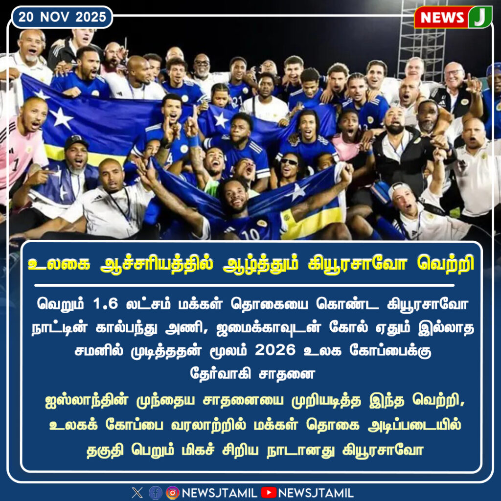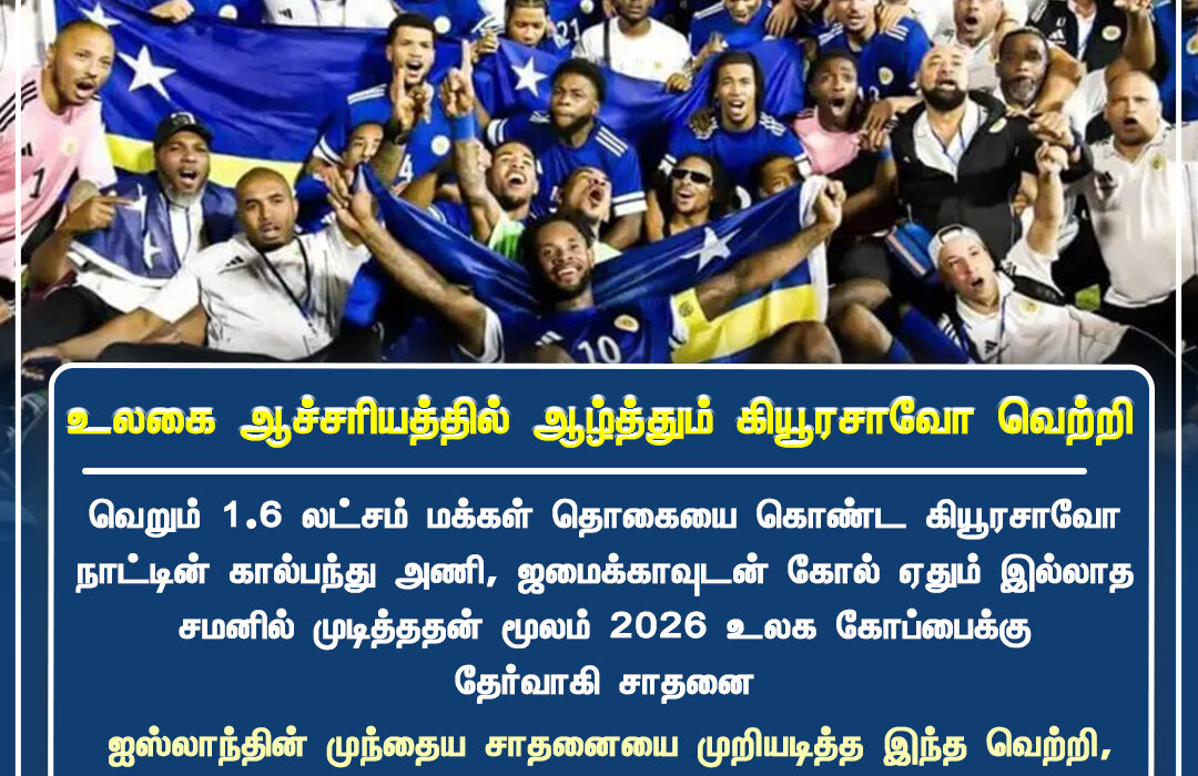 வெறும் 1.6 லட்சம் மக்கள் தொகையுள்ள கியூரசாவோ நாடு, அணி ஜமைக்காவுடன் கோல் ரதம் இல்லாத சமனில் முடித்ததின் மூலம் 2026 உலகக் கோப்பைக்கான தகுதி போட்டியில் பெரிய முன்னேற்றம் கண்டுள்ளது. இது அந்த தீவு நாட்டின் கால்பந்து வரலாற்றில் மிகப் பெரிய நாள் என ரசிகர்கள் கொண்டாடுகின்றனர்.