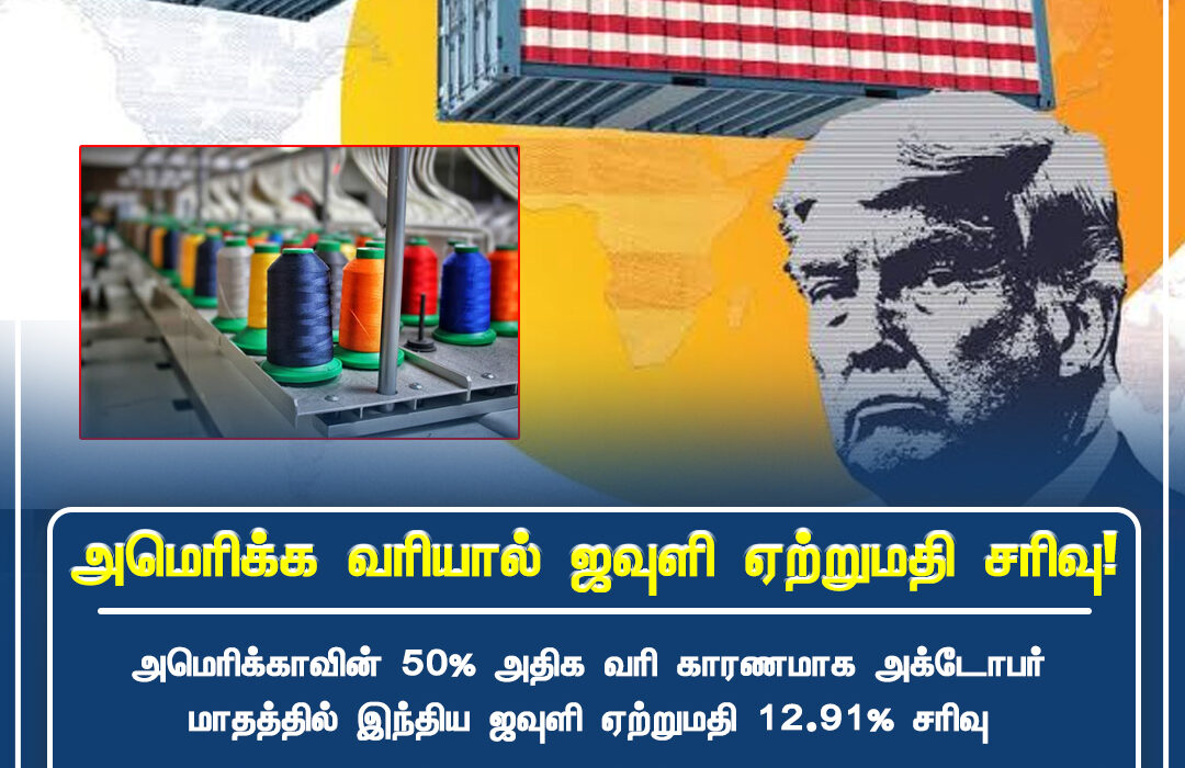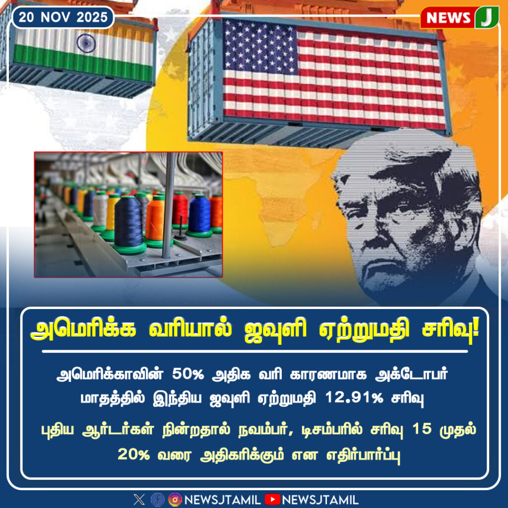 தமிழகமும் இந்தியாவின் பல மாநிலங்களிலிருந்தும் அமெரிக்காவுக்கான ஜூலி ஏற்றுமதி நவம்பர் மாதத்தில் 12.91% வரை குறைந்துள்ளதாக தொழில் வட்டாரங்கள் தெரிவிக்கின்றன. அமெரிக்கா விதித்த 50% வரை உயர்ந்த வரி, இந்திய ஜூலி சந்தைக்கு பெரிய பின்னடைவை ஏற்படுத்தியுள்ளது.
