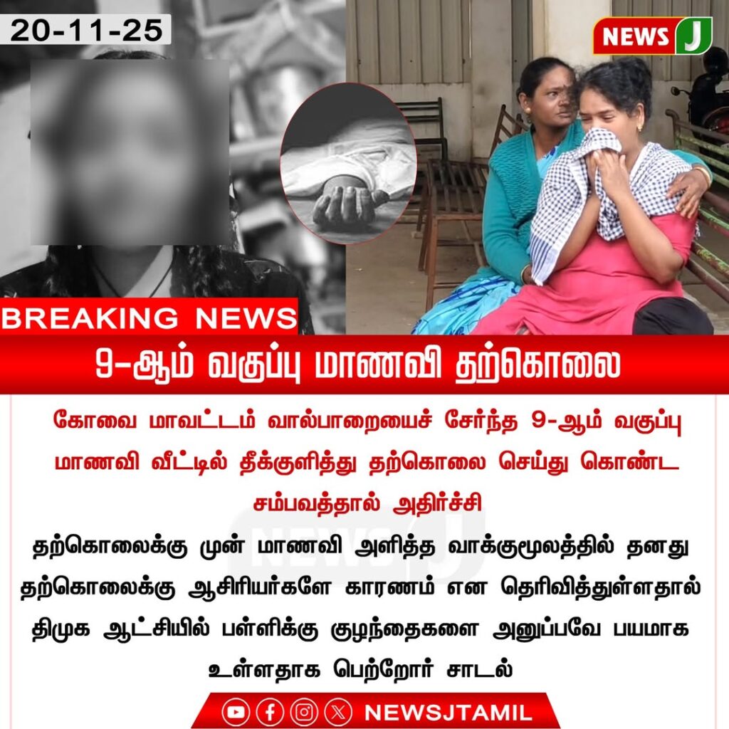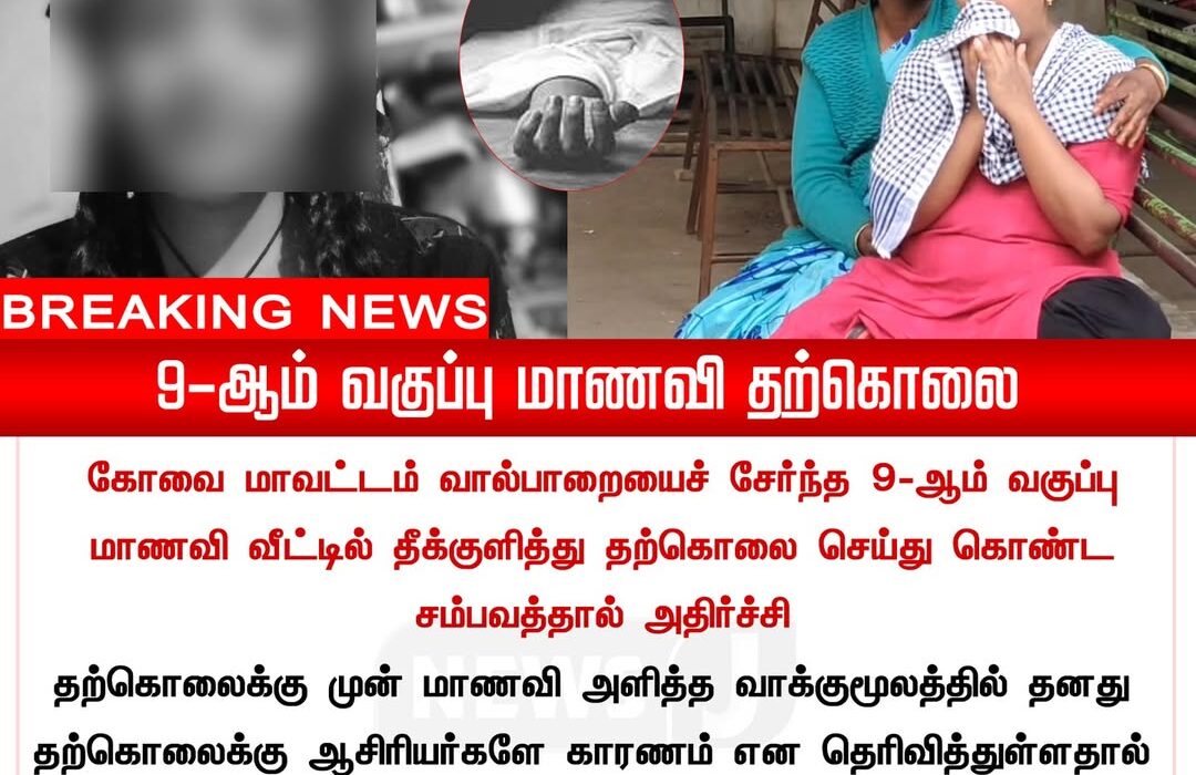 கோவை மாவட்டத்தில் 9ஆம் வகுப்பு மாணவி தற்கொலை செய்த சம்பவம் அதிர்ச்சி | Shocking suicide of a 9th-grade girl in Coimbatore district