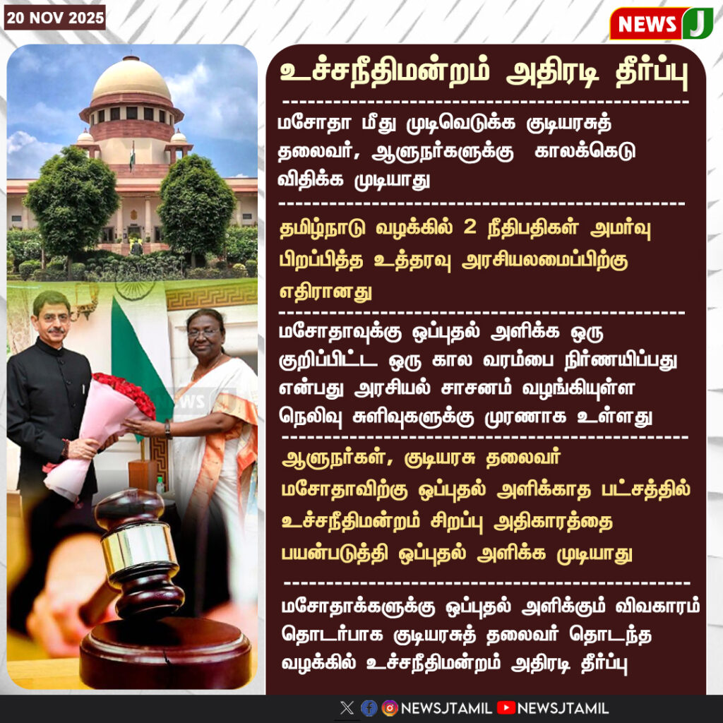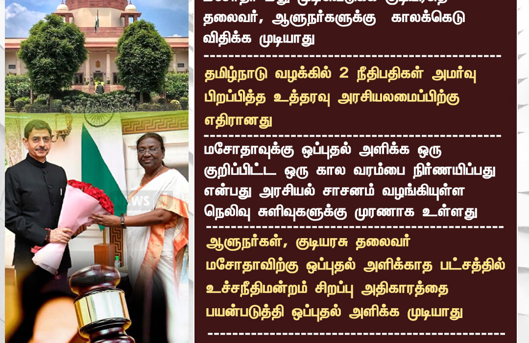 உச்சநீதிமன்றம் இன்று மன்சோதை ஒப்புதல் வழங்கும் செயல்முறைகளில் குடியரசுத் தலைவர் மற்றும் ஆளுநர்களுக்கு காலக்கெடு நிர்ணயிக்க முடியாது என்று முக்கியமான தீர்ப்பை வெளியிட்டது. இது மாநில அரசுகள் வலியுறுத்திவந்த கோரிக்கைகளுக்கு தெளிவான சட்ட விளக்கமாகும்.
