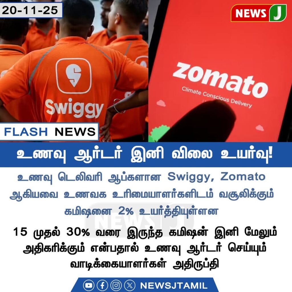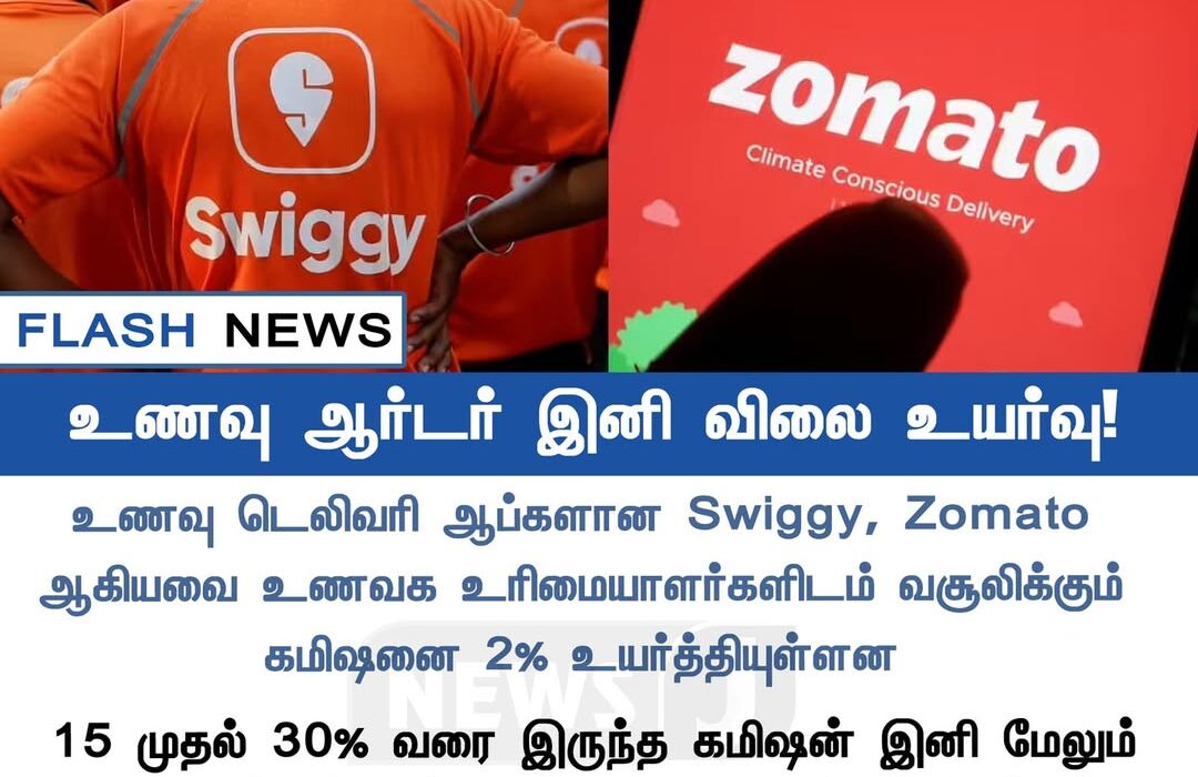 உணவு டெலிவரி பயன்பாடுகள் ஆகிய Swiggy, Zomato நிறுவனங்கள் உணவக உரிமையாளர்களிடம் வசூலிக்கும் கமிஷனை 2% உயர்த்தியுள்ளதாக தகவல் வெளியாகியுள்ளது. இதன் தாக்கம் நேரடியாக உணவு விலைகளிலும் எதிரொலிக்கும் என கூறப்படுகிறது.