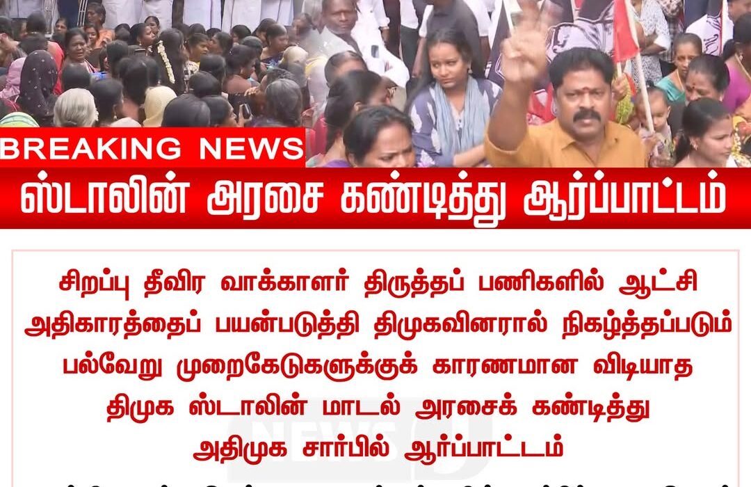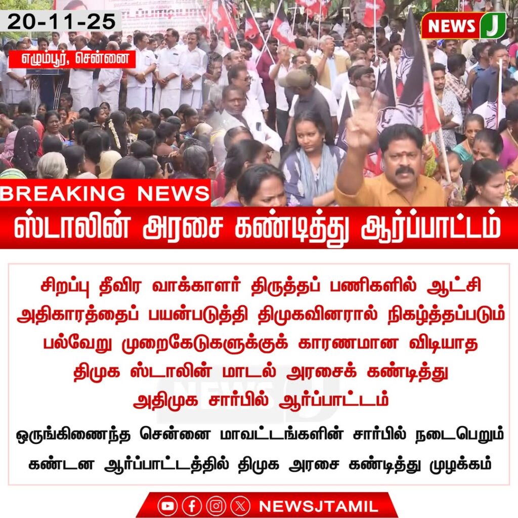 சென்னையின் எழும்பூர் பகுதியில் சிறப்பு தீவிர வாக்காளர் திருத்தப் பணிகளில் அதிகார துஷ்பிரயோகம் நடந்ததாக கூறி திமுகவினரால் நடைபெற்று வந்த பல்வேறு நடவடிக்கைகளுக்கு எதிர்ப்பு தெரிவிக்கப்பட்டது. இதனை கண்டித்து ஸ்டாலின் தலைமையிலான மாவட்ட அரசை குற்றம் சாட்டி பொதுமக்கள் சாலையில் இறங்கி ஆர்ப்பாட்டத்தில் ஈடுபட்டனர்.