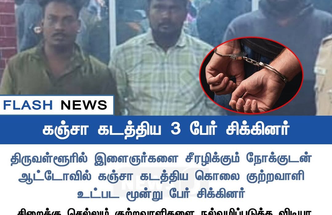 Police in Thiruvallur have arrested three individuals, including a murder accused, who were smuggling ganja in an auto-rickshaw. A large quantity of contraband was seized during the operation.