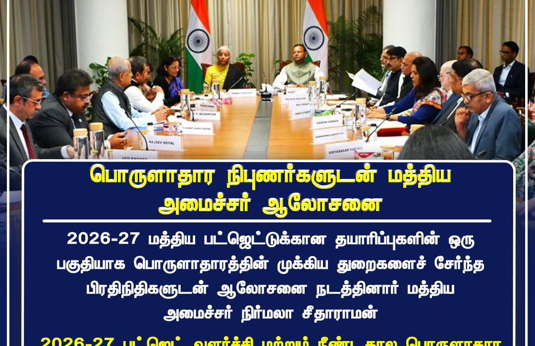 2026–27 மத்திய பட்ஜெட்டுக்கான தயாரிப்புகளின் ஒரு பகுதியாக, பொருளாதார துறையின் முக்கிய நிபுணர்களுடன் மத்திய அமைச்சர் நிர்மலா சீதாராமன் ஆலோசனை நடத்தினார். பொருளாதார வளர்ச்சி, முதலீடு, வேலை வாய்ப்புகள், நிதி நிலைத்தன்மை போன்ற விடயங்களில் விரிவான கருத்துப்பரிமாற்றம் நடைபெற்றதாக தகவல்கள் தெரிவிக்கின்றன.