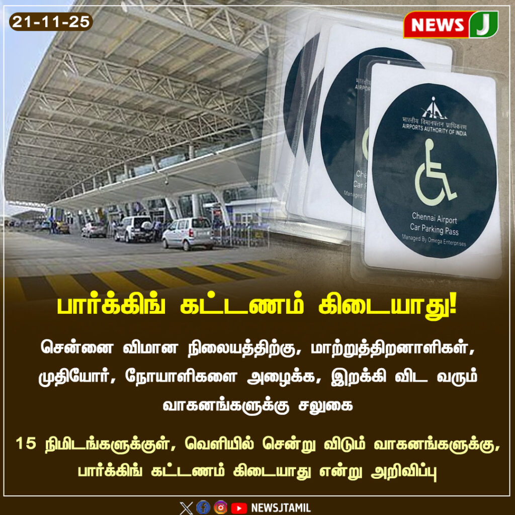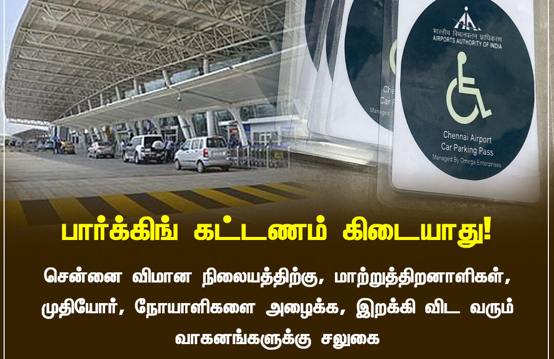 Chennai Airport has announced that vehicles bringing persons with disabilities, senior citizens, or patients will no longer be charged any parking fee. The exemption comes into immediate effect, aiming to support hassle-free passenger movement.