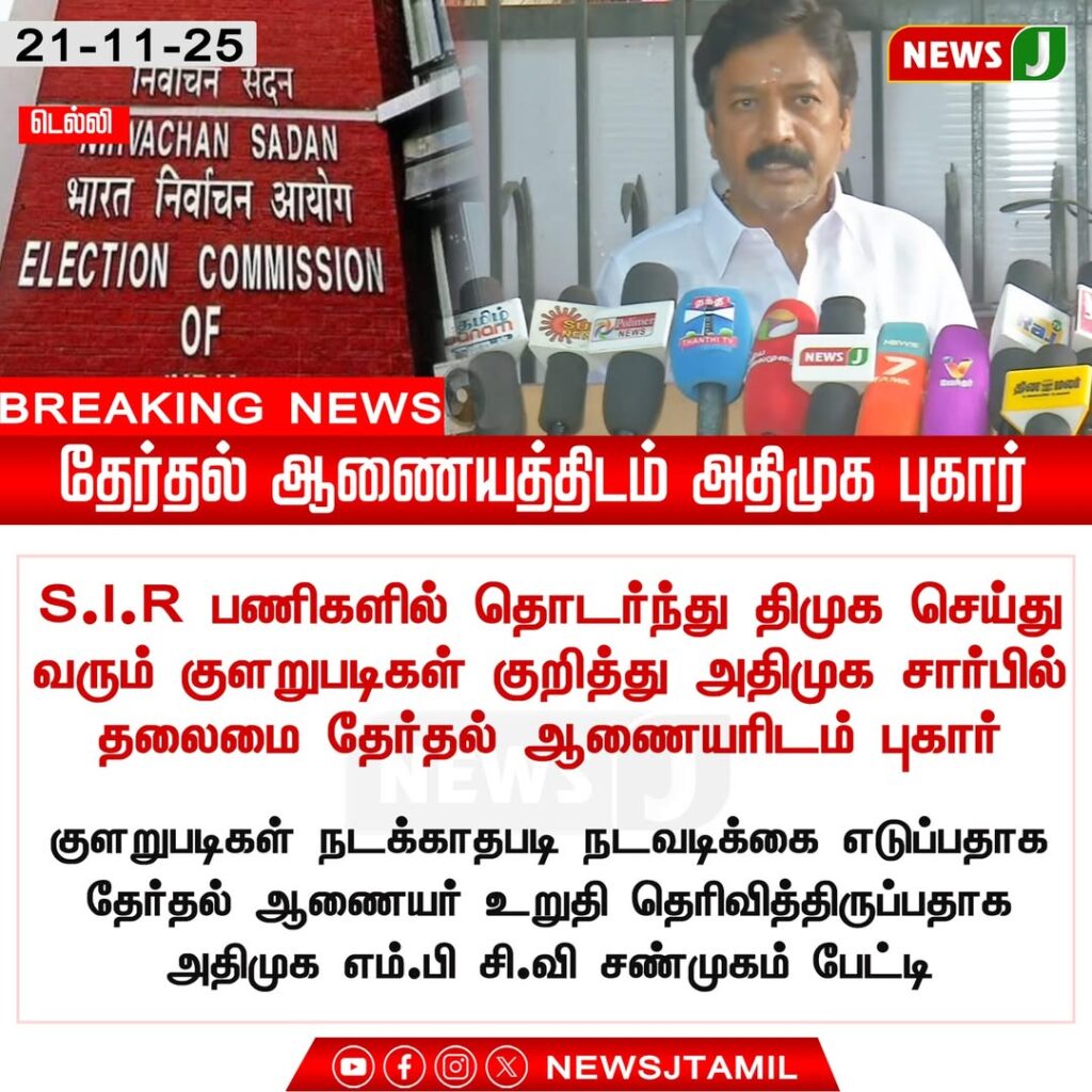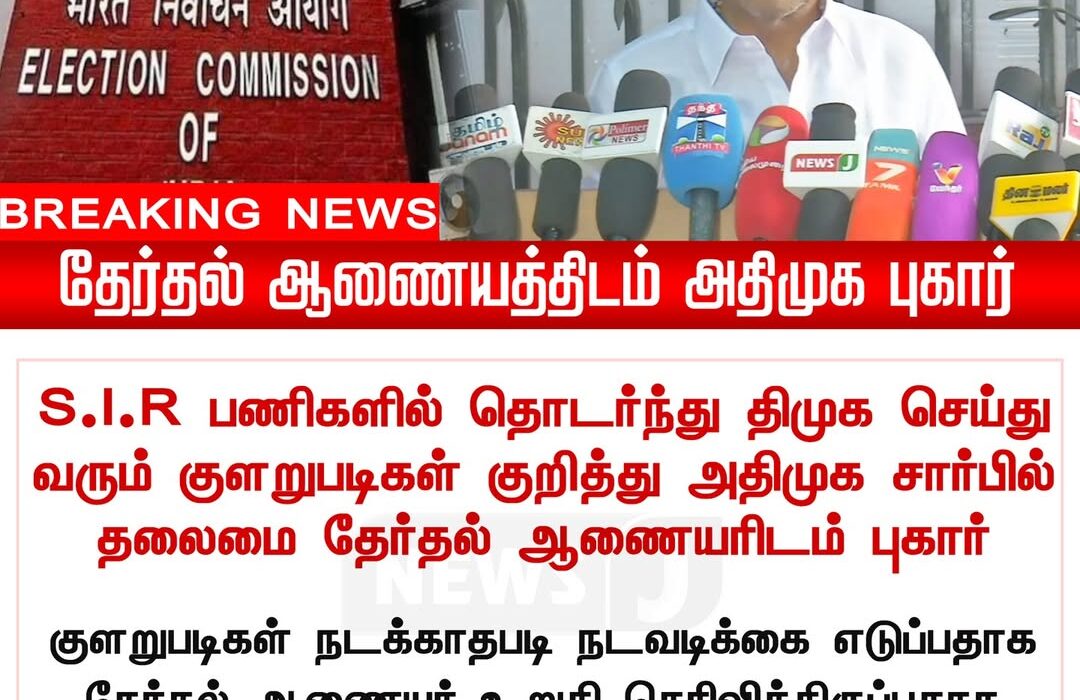 சென்னையில் தேர்தல் சூழல் சூடுபிடித்த நிலையில், S.I.R பணிகளில் திமுக செய்பவர்கள் தங்களது கட்சிச்செயல்களைத் திணிக்கிறார்கள் என்பதை குற்றம் சாட்டி அதிமுக தலைமையகம் தேர்தல் ஆணையத்திடம் இன்று புகார் அளித்துள்ளது.